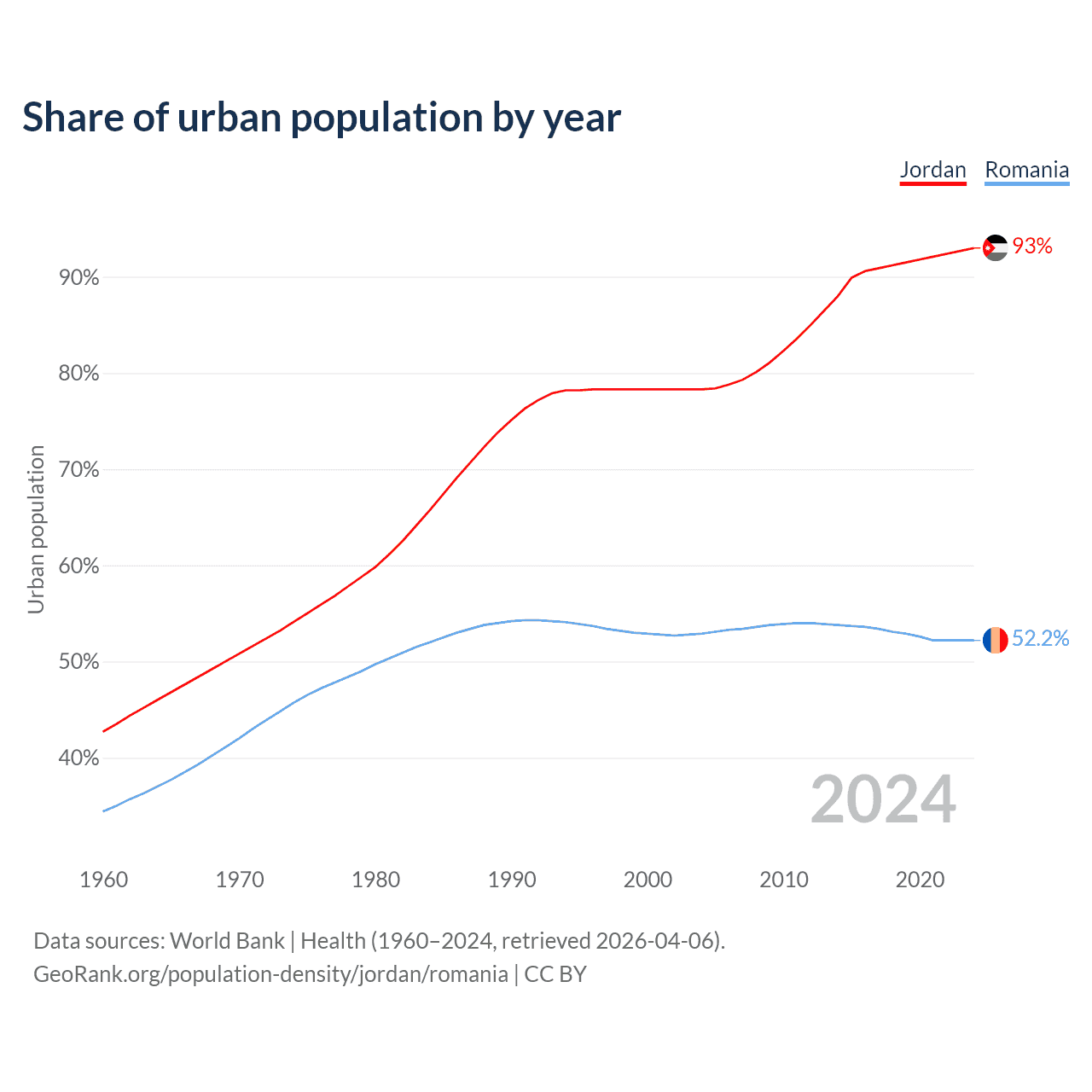 From 2004 to 2024, the share of urban population changed from 78.3% to 93% in Jordan and from 52.9% to 52.2% in Romania.