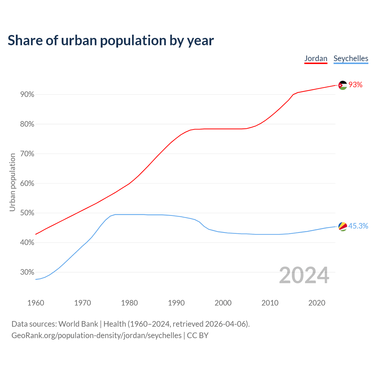 From 2004 to 2024, the share of urban population changed from 78.3% to 93% in Jordan and from 42.9% to 45.3% in the Seychelles.