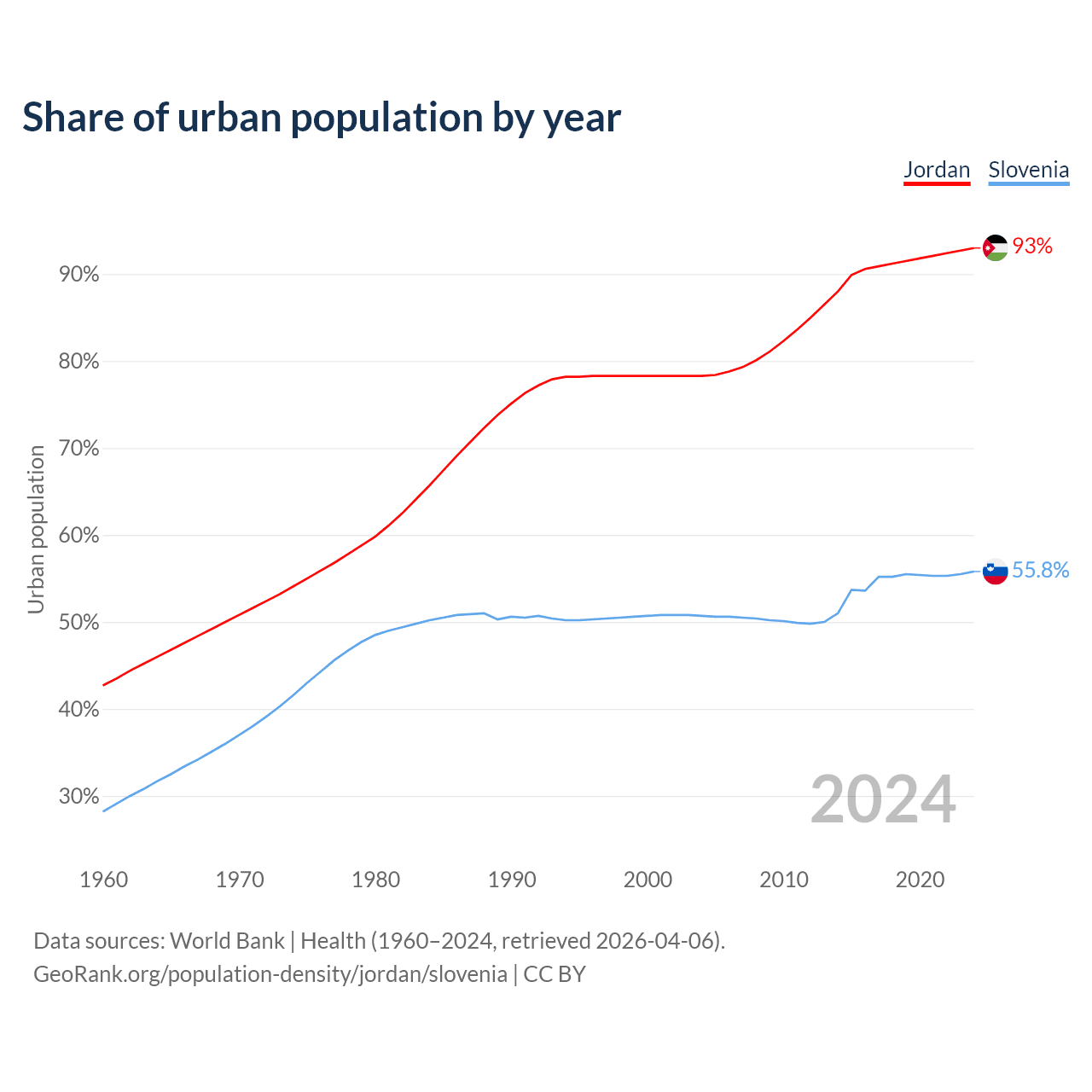 From 2004 to 2024, the share of urban population changed from 78.3% to 93% in Jordan and from 50.7% to 55.8% in Slovenia.