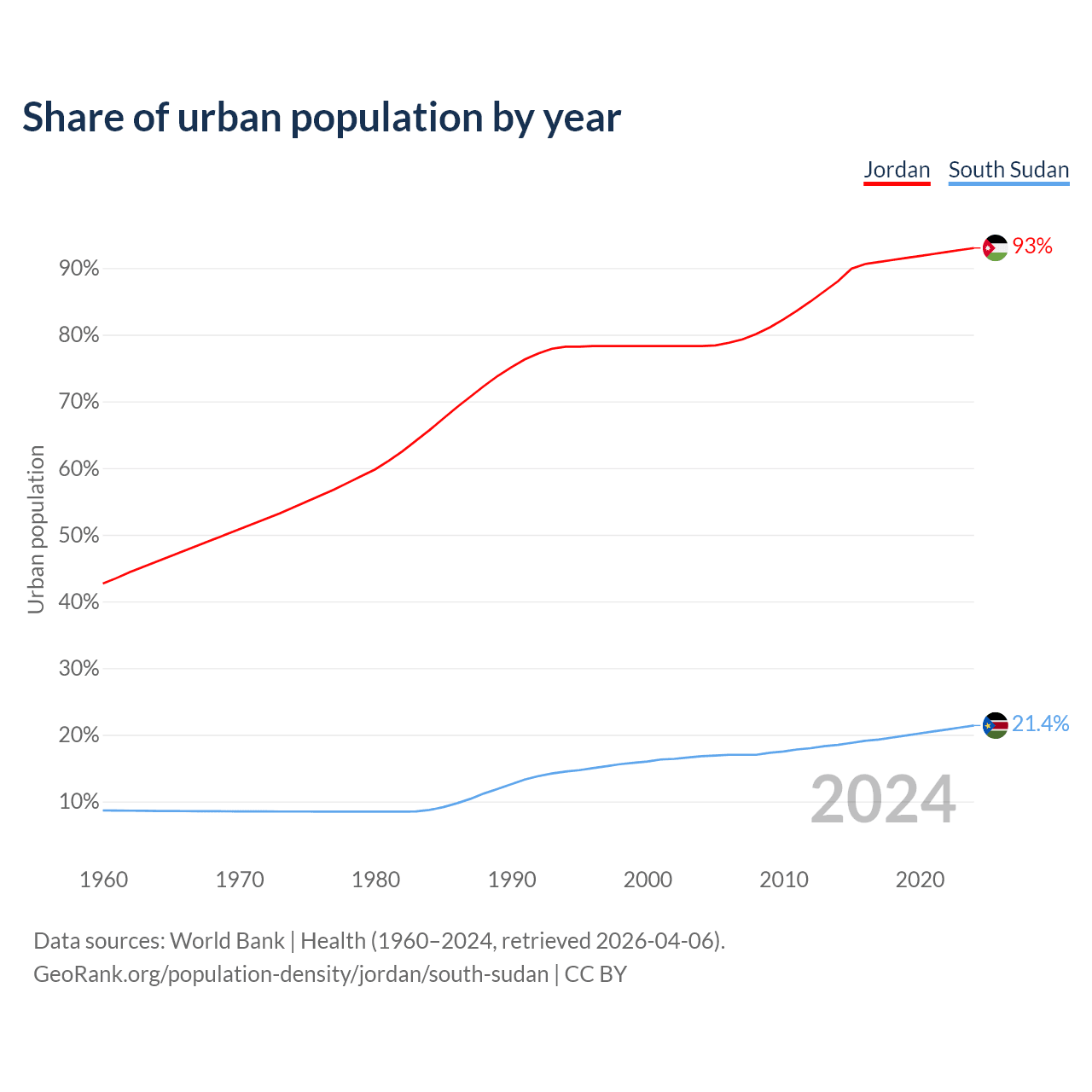 From 2004 to 2024, the share of urban population changed from 78.3% to 93% in Jordan and from 16.8% to 21.4% in South Sudan.