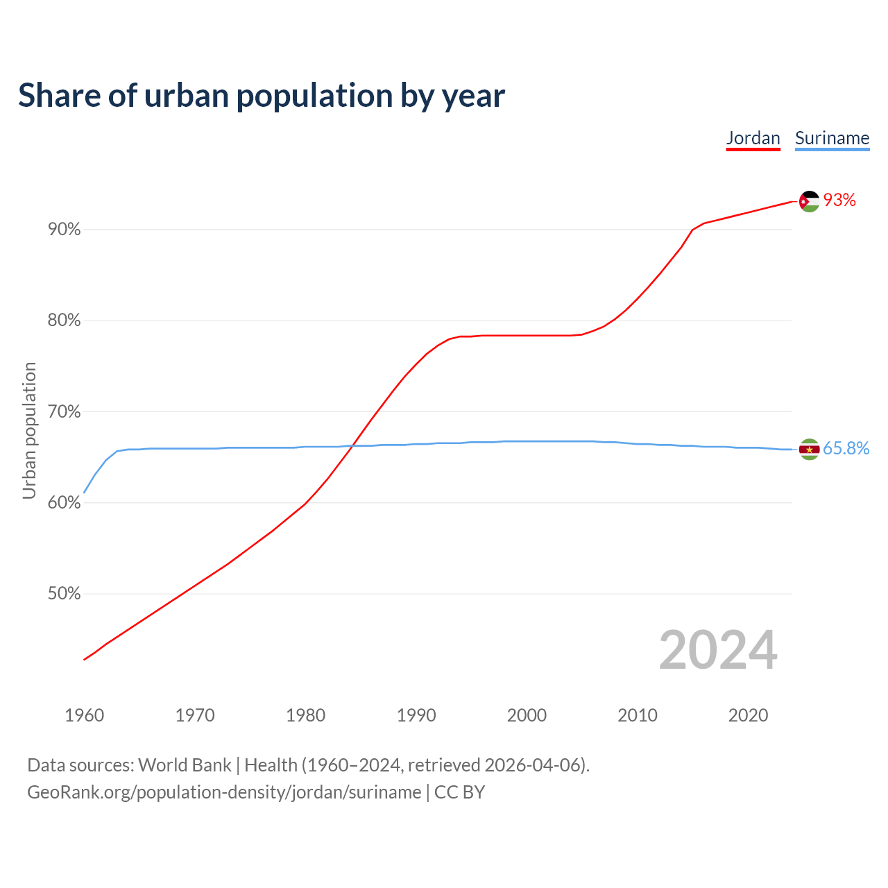 From 2004 to 2024, the share of urban population changed from 78.3% to 93% in Jordan and from 66.7% to 65.8% in Suriname.