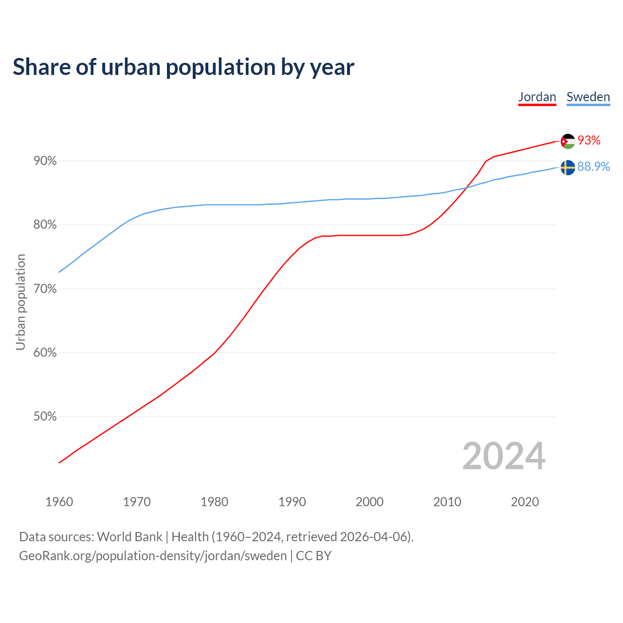 From 2004 to 2024, the share of urban population changed from 78.3% to 93% in Jordan and from 84.3% to 88.9% in Sweden.