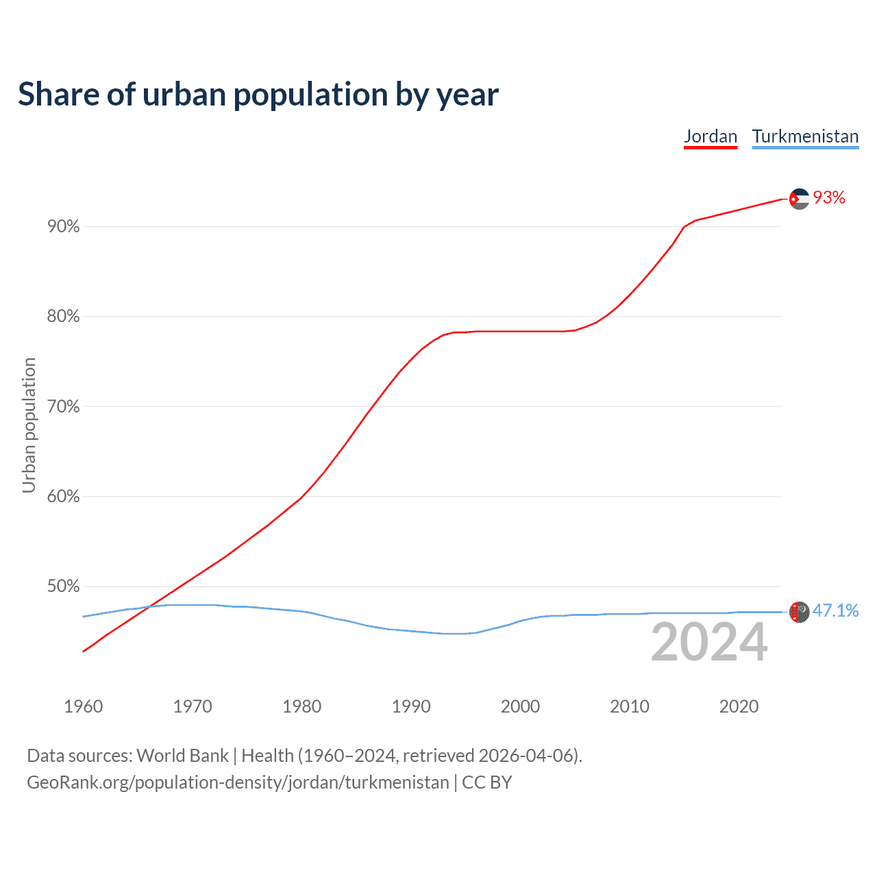 From 2004 to 2024, the share of urban population changed from 78.3% to 93% in Jordan and from 46.7% to 47.1% in Turkmenistan.