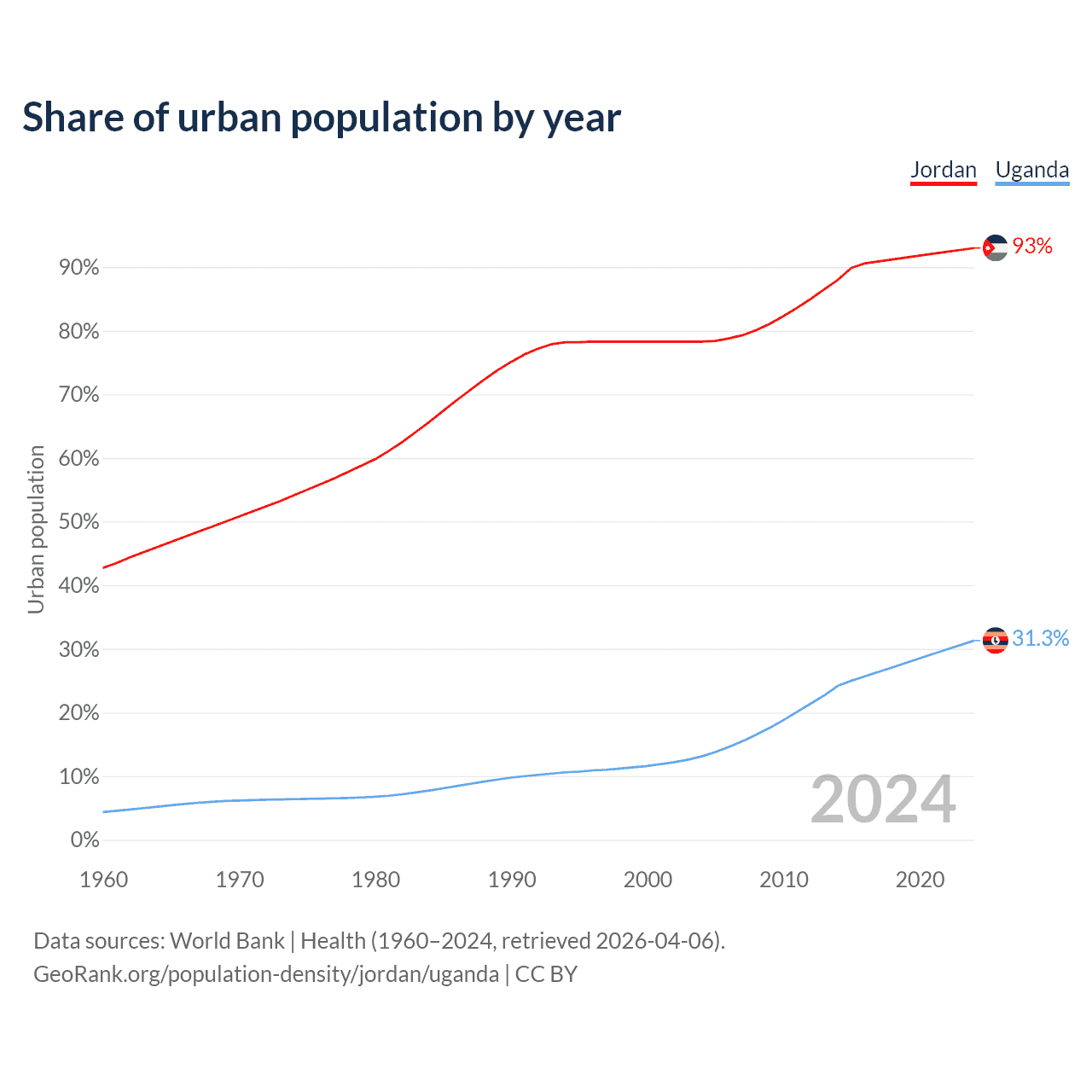 From 2004 to 2024, the share of urban population changed from 78.3% to 93% in Jordan and from 13.1% to 31.3% in Uganda.