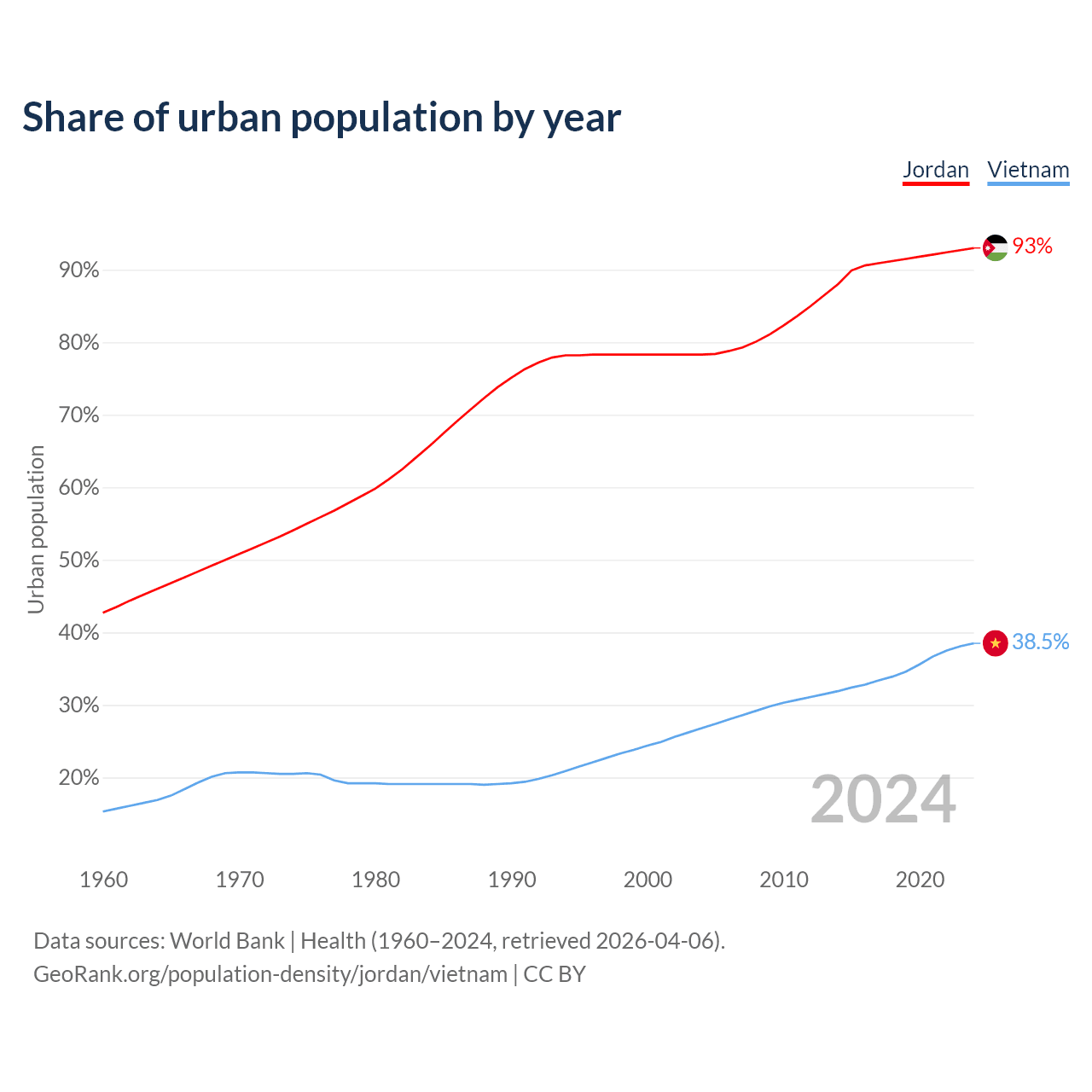 From 2004 to 2024, the share of urban population changed from 78.3% to 93% in Jordan and from 26.8% to 38.5% in Vietnam.