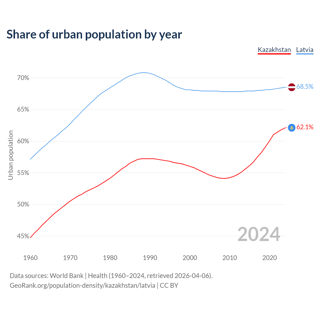 From 2004 to 2024, the share of urban population changed from 54.9% to 62.1% in Kazakhstan and from 67.9% to 68.5% in Latvia.