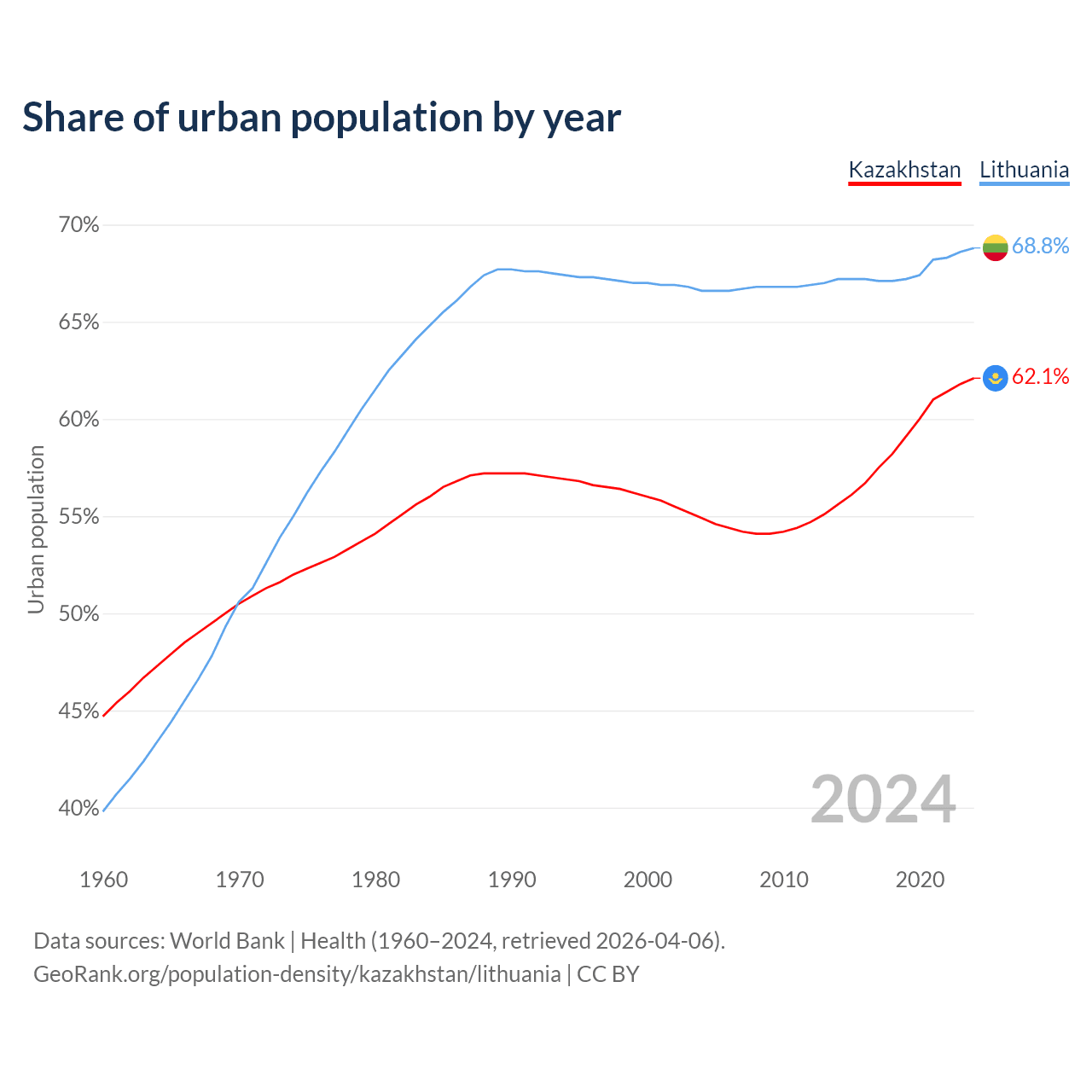 From 2004 to 2024, the share of urban population changed from 54.9% to 62.1% in Kazakhstan and from 66.6% to 68.8% in Lithuania.