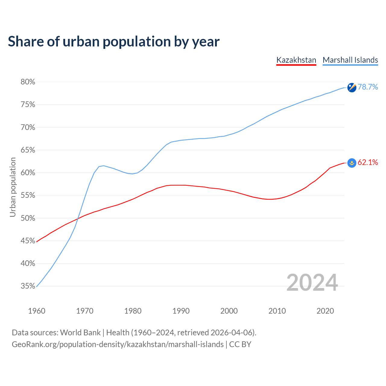 From 2004 to 2024, the share of urban population changed from 54.9% to 62.1% in Kazakhstan and from 70.1% to 78.7% in the Marshall Islands.