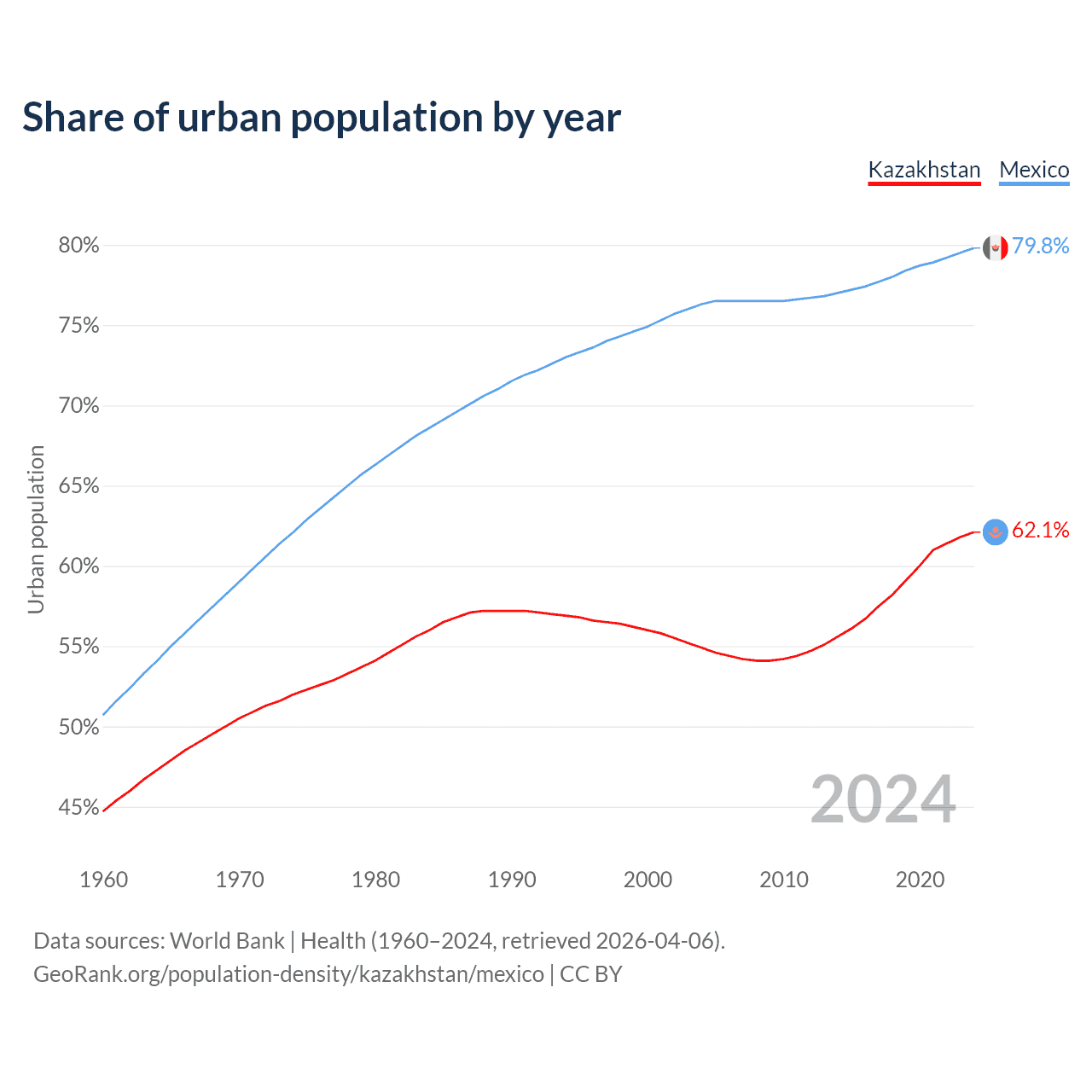 From 2004 to 2024, the share of urban population changed from 54.9% to 62.1% in Kazakhstan and from 76.3% to 79.8% in Mexico.