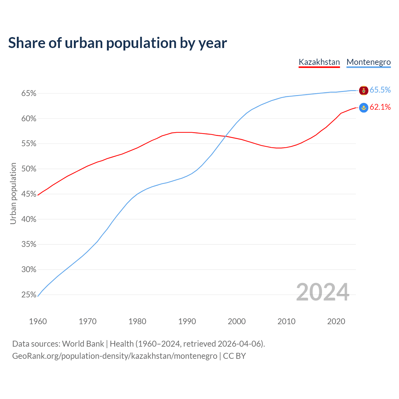 From 2004 to 2024, the share of urban population changed from 54.9% to 62.1% in Kazakhstan and from 62.2% to 65.5% in Montenegro.