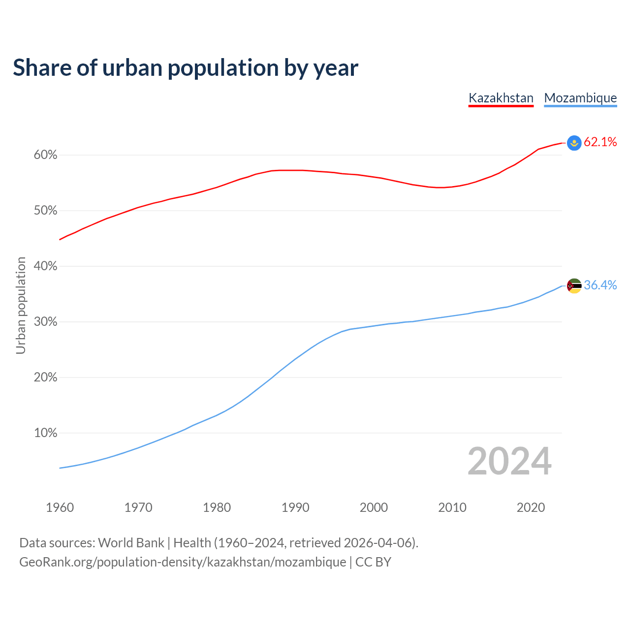 From 2004 to 2024, the share of urban population changed from 54.9% to 62.1% in Kazakhstan and from 29.9% to 36.4% in Mozambique.