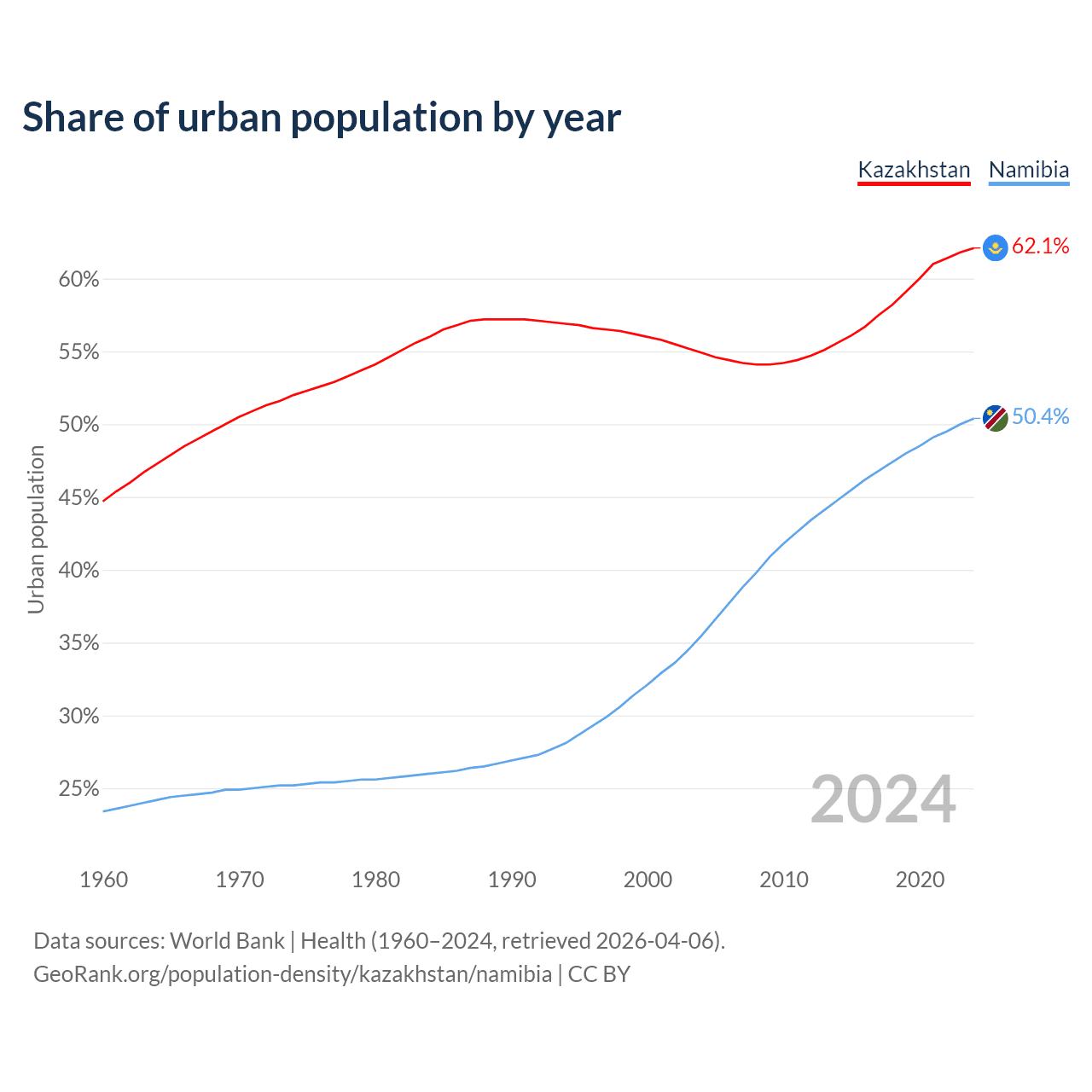 From 2004 to 2024, the share of urban population changed from 54.9% to 62.1% in Kazakhstan and from 35.5% to 50.4% in Namibia.