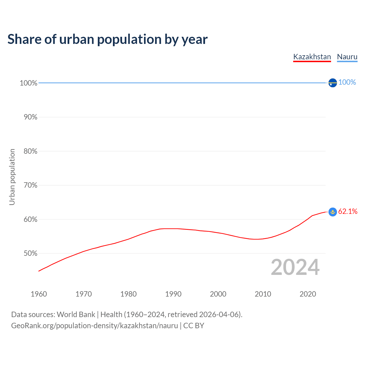 From 2004 to 2024, the share of urban population changed from 54.9% to 62.1% in Kazakhstan and from 100% to 100% in Nauru.