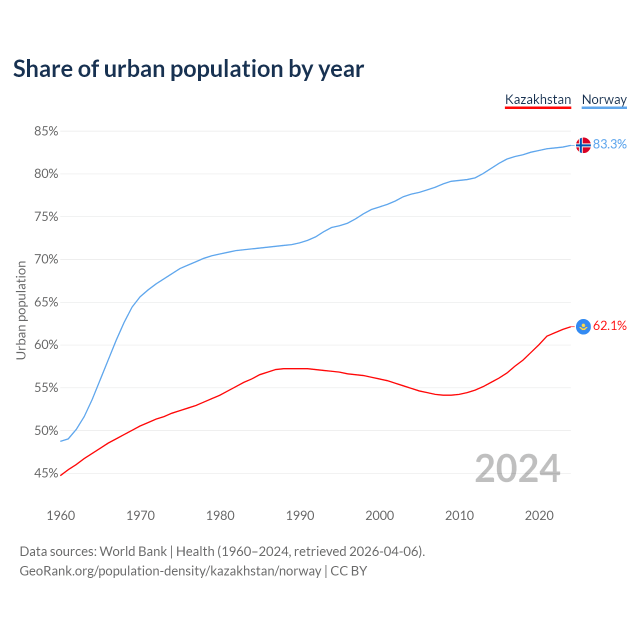 From 2004 to 2024, the share of urban population changed from 54.9% to 62.1% in Kazakhstan and from 77.6% to 83.3% in Norway.