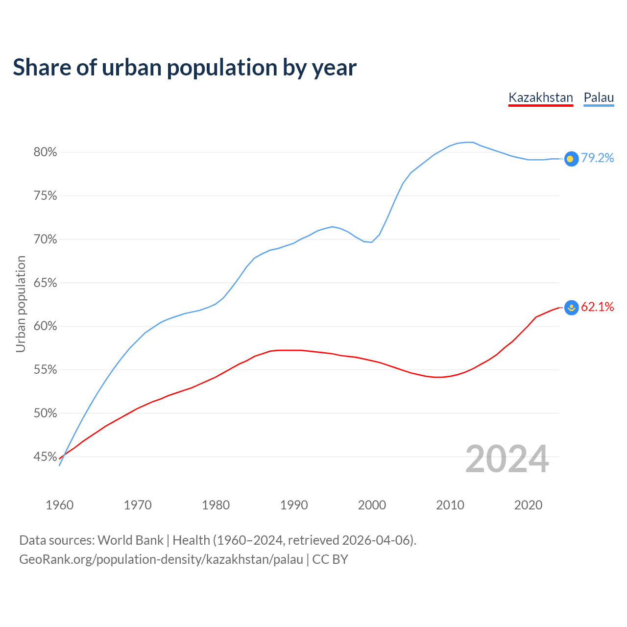 From 2004 to 2024, the share of urban population changed from 54.9% to 62.1% in Kazakhstan and from 76.4% to 79.2% in Palau.