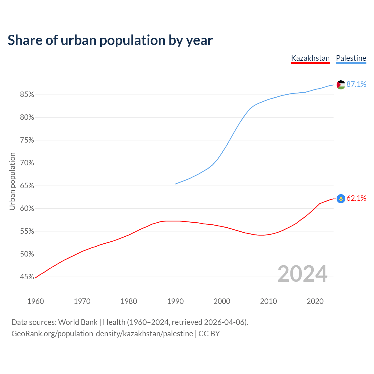 From 2004 to 2024, the share of urban population changed from 54.9% to 62.1% in Kazakhstan and from 79% to 87.1% in Palestine.