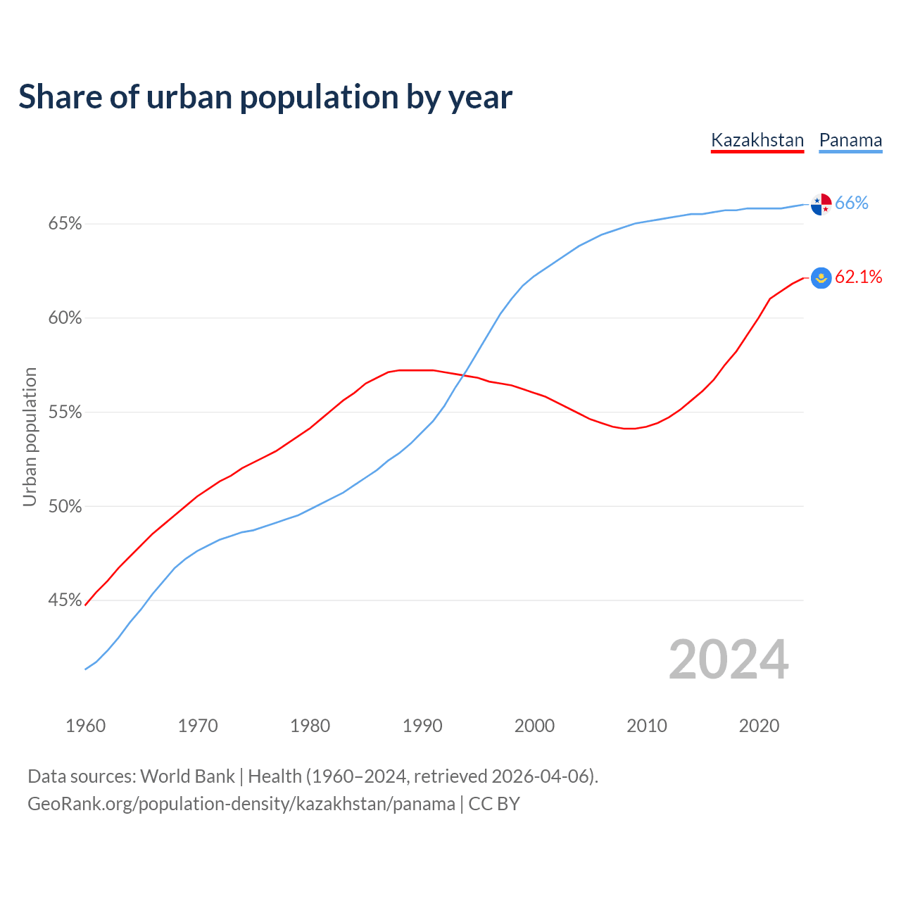 From 2004 to 2024, the share of urban population changed from 54.9% to 62.1% in Kazakhstan and from 63.8% to 66% in Panama.