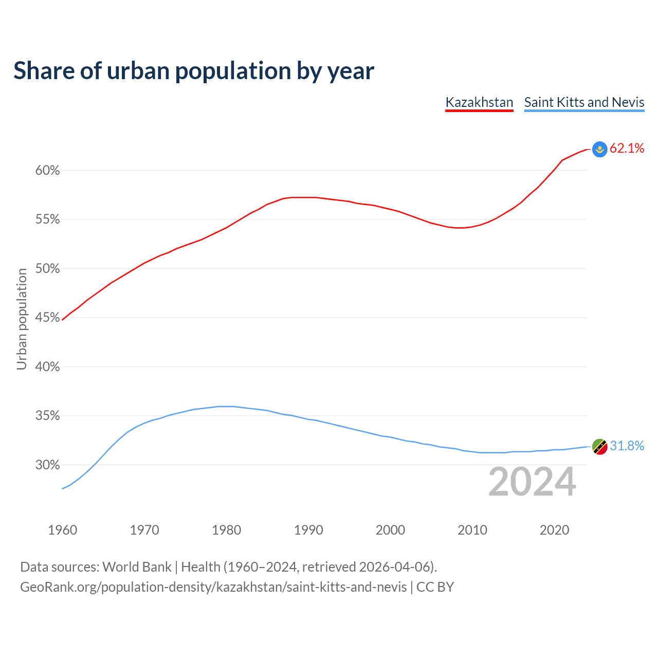 From 2004 to 2024, the share of urban population changed from 54.9% to 62.1% in Kazakhstan and from 32.1% to 31.8% in Saint Kitts and Nevis.