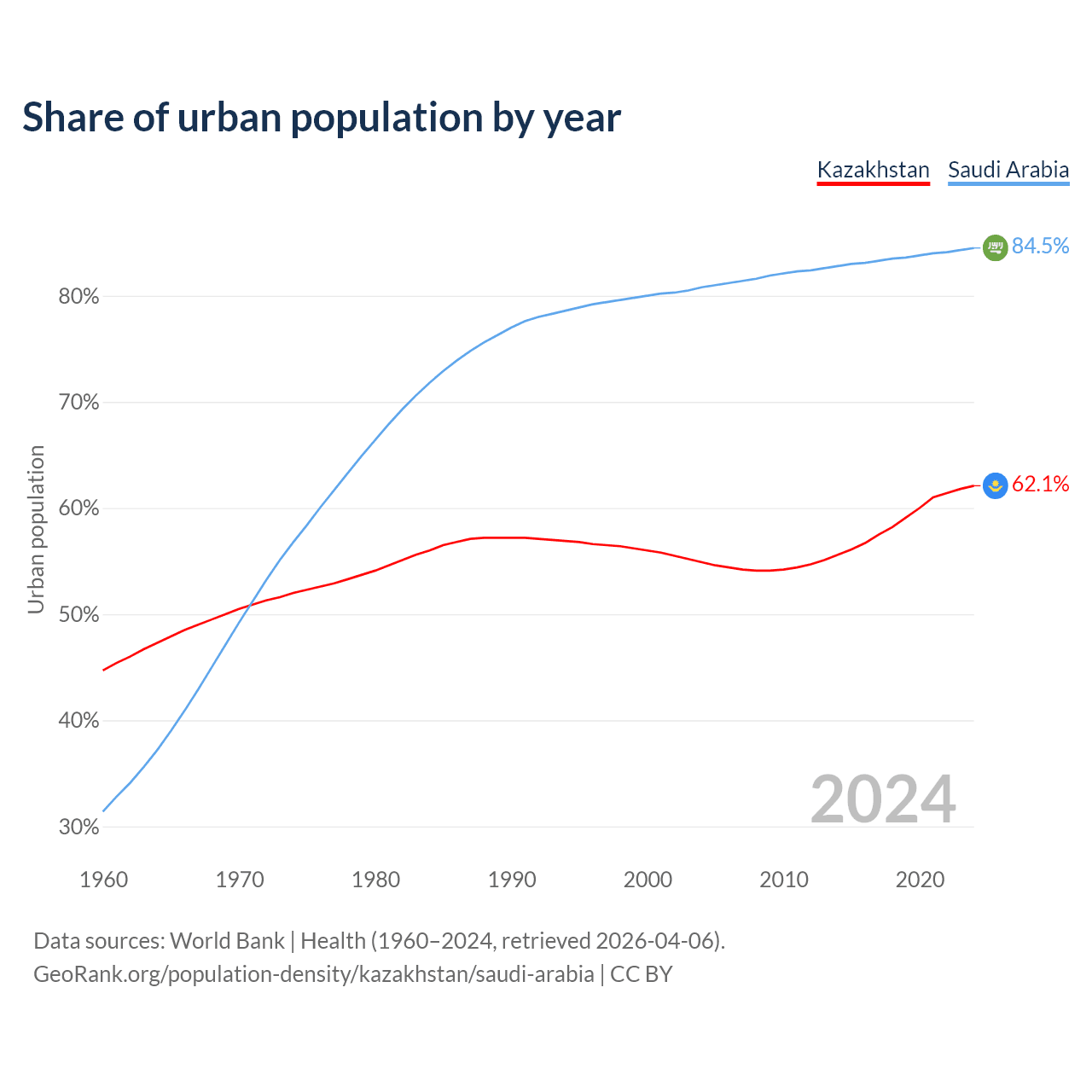 From 2004 to 2024, the share of urban population changed from 54.9% to 62.1% in Kazakhstan and from 80.8% to 84.5% in Saudi Arabia.