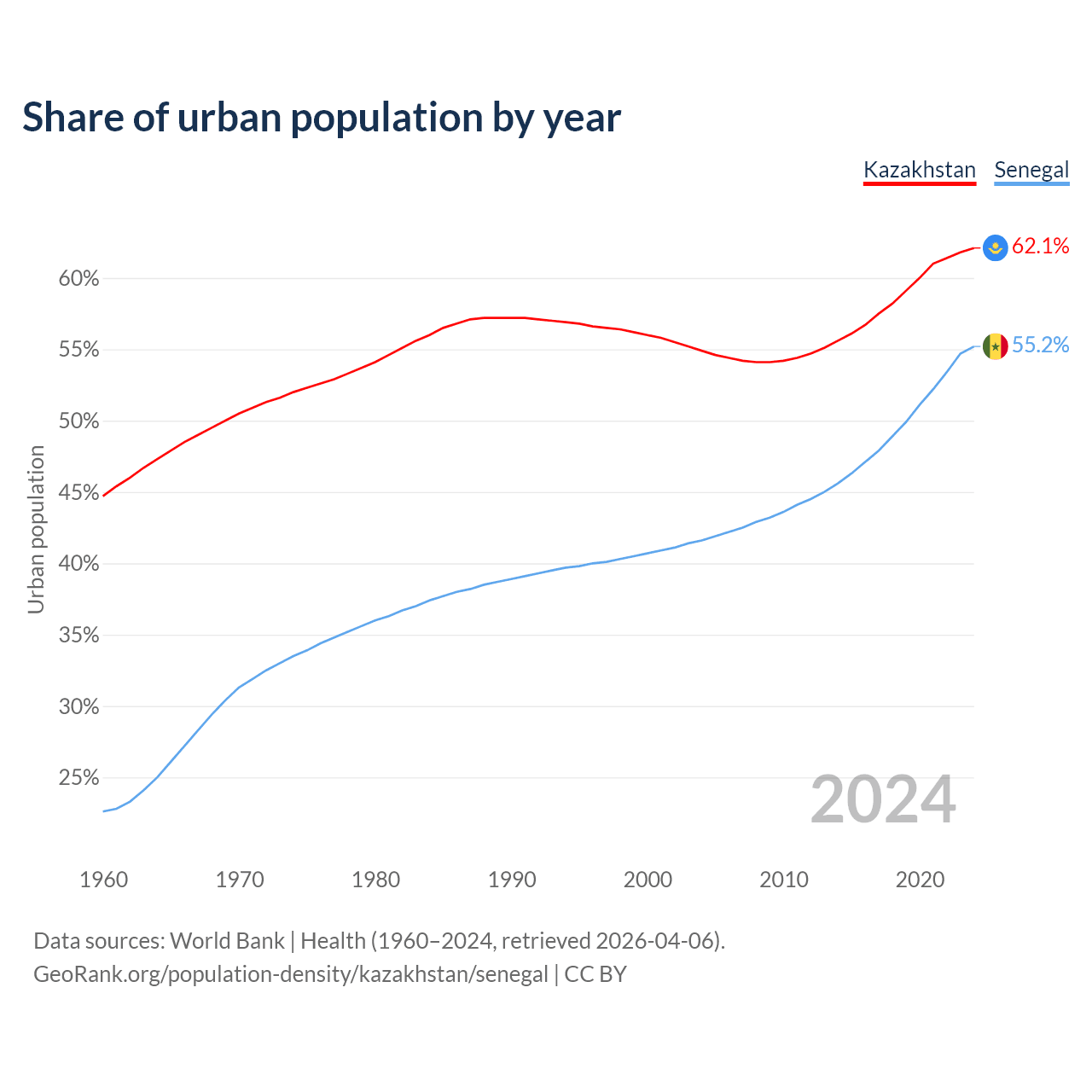 From 2004 to 2024, the share of urban population changed from 54.9% to 62.1% in Kazakhstan and from 41.6% to 55.2% in Senegal.