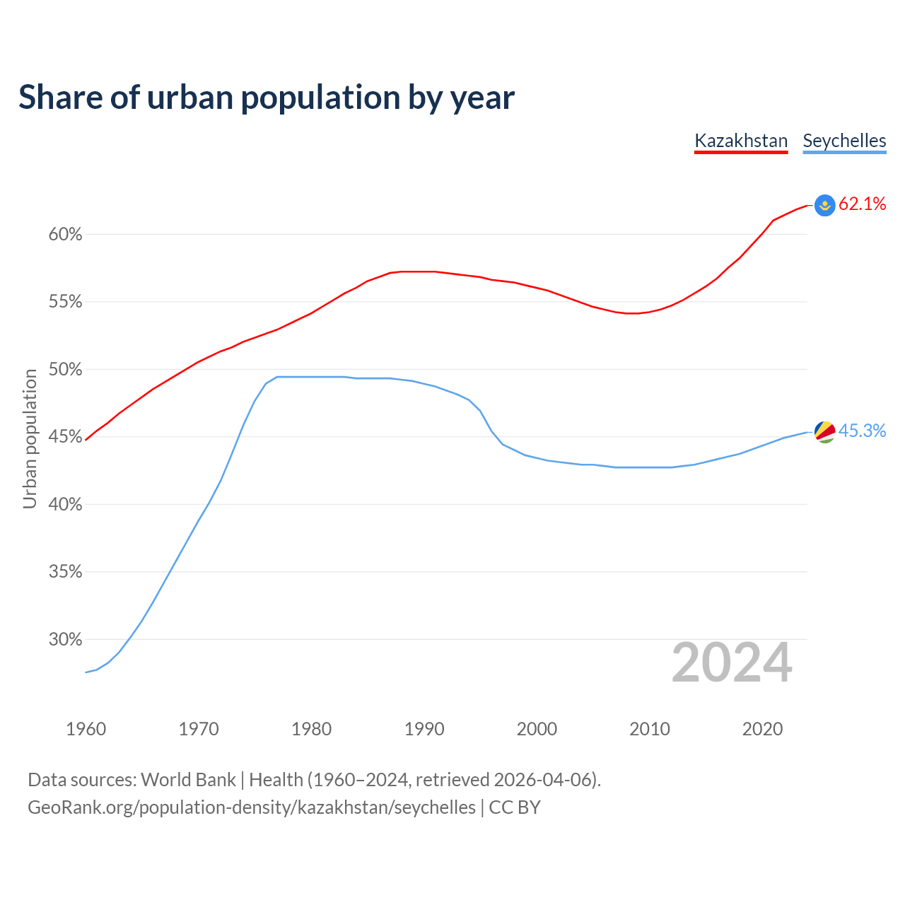 From 2004 to 2024, the share of urban population changed from 54.9% to 62.1% in Kazakhstan and from 42.9% to 45.3% in the Seychelles.