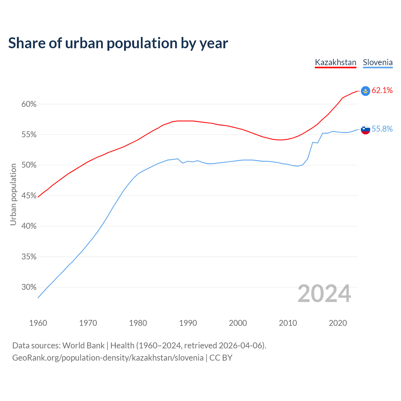 From 2004 to 2024, the share of urban population changed from 54.9% to 62.1% in Kazakhstan and from 50.7% to 55.8% in Slovenia.