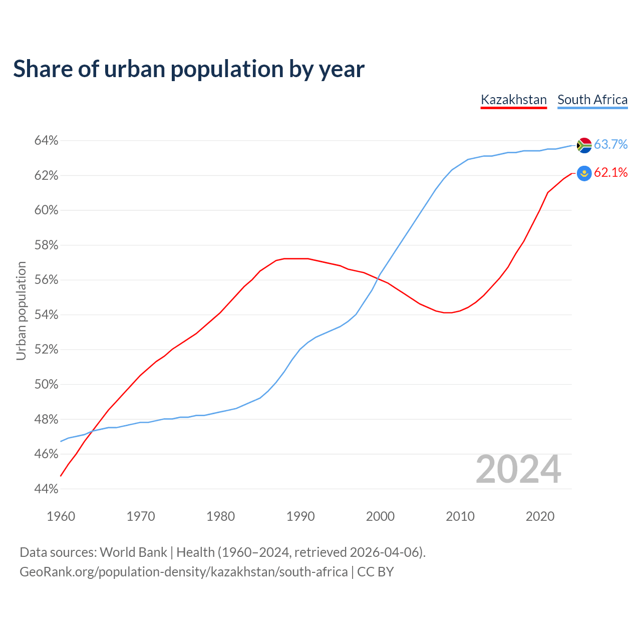 From 2004 to 2024, the share of urban population changed from 54.9% to 62.1% in Kazakhstan and from 59.1% to 63.7% in South Africa.
