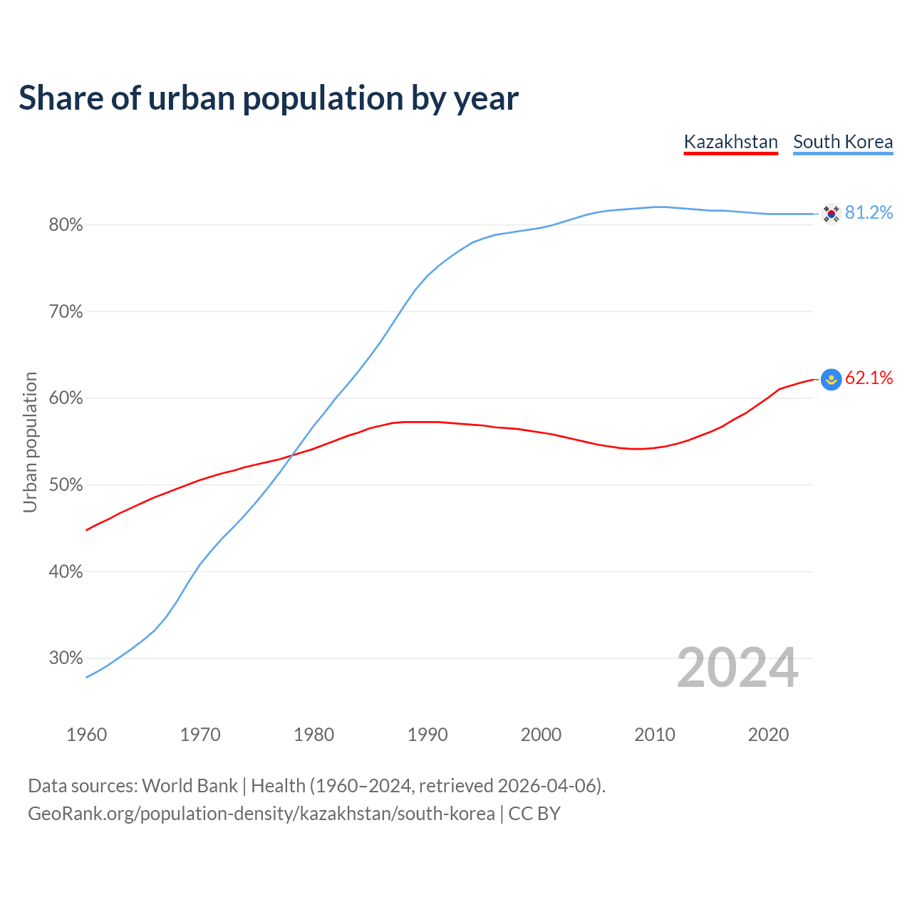 From 2004 to 2024, the share of urban population changed from 54.9% to 62.1% in Kazakhstan and from 81.1% to 81.2% in South Korea.