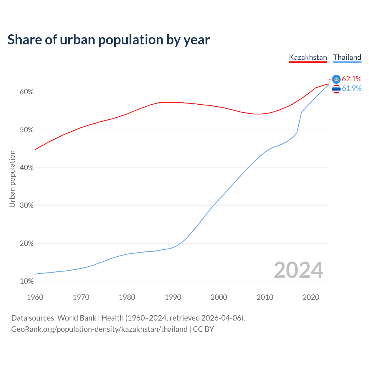 From 2004 to 2024, the share of urban population changed from 54.9% to 62.1% in Kazakhstan and from 36.8% to 61.9% in Thailand.