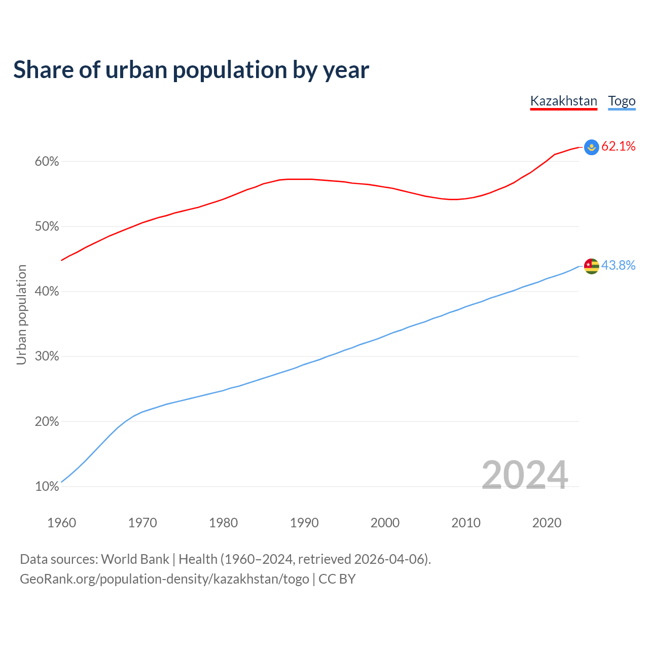 From 2004 to 2024, the share of urban population changed from 54.9% to 62.1% in Kazakhstan and from 34.9% to 43.8% in Togo.