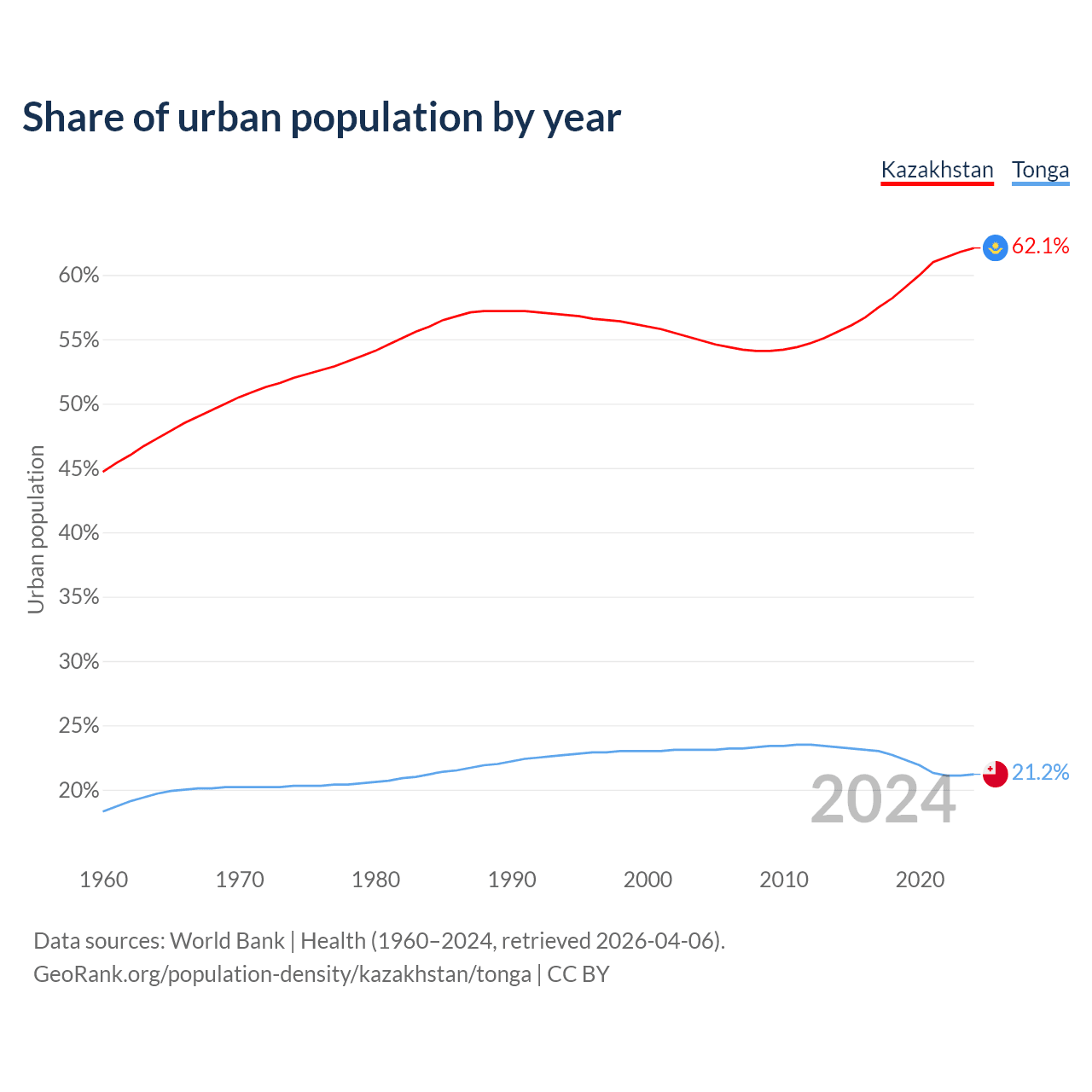 From 2004 to 2024, the share of urban population changed from 54.9% to 62.1% in Kazakhstan and from 23.1% to 21.2% in Tonga.