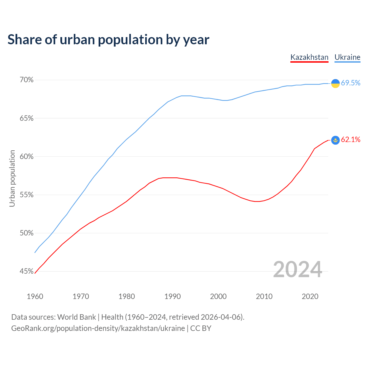 From 2004 to 2024, the share of urban population changed from 54.9% to 62.1% in Kazakhstan and from 67.6% to 69.5% in Ukraine.