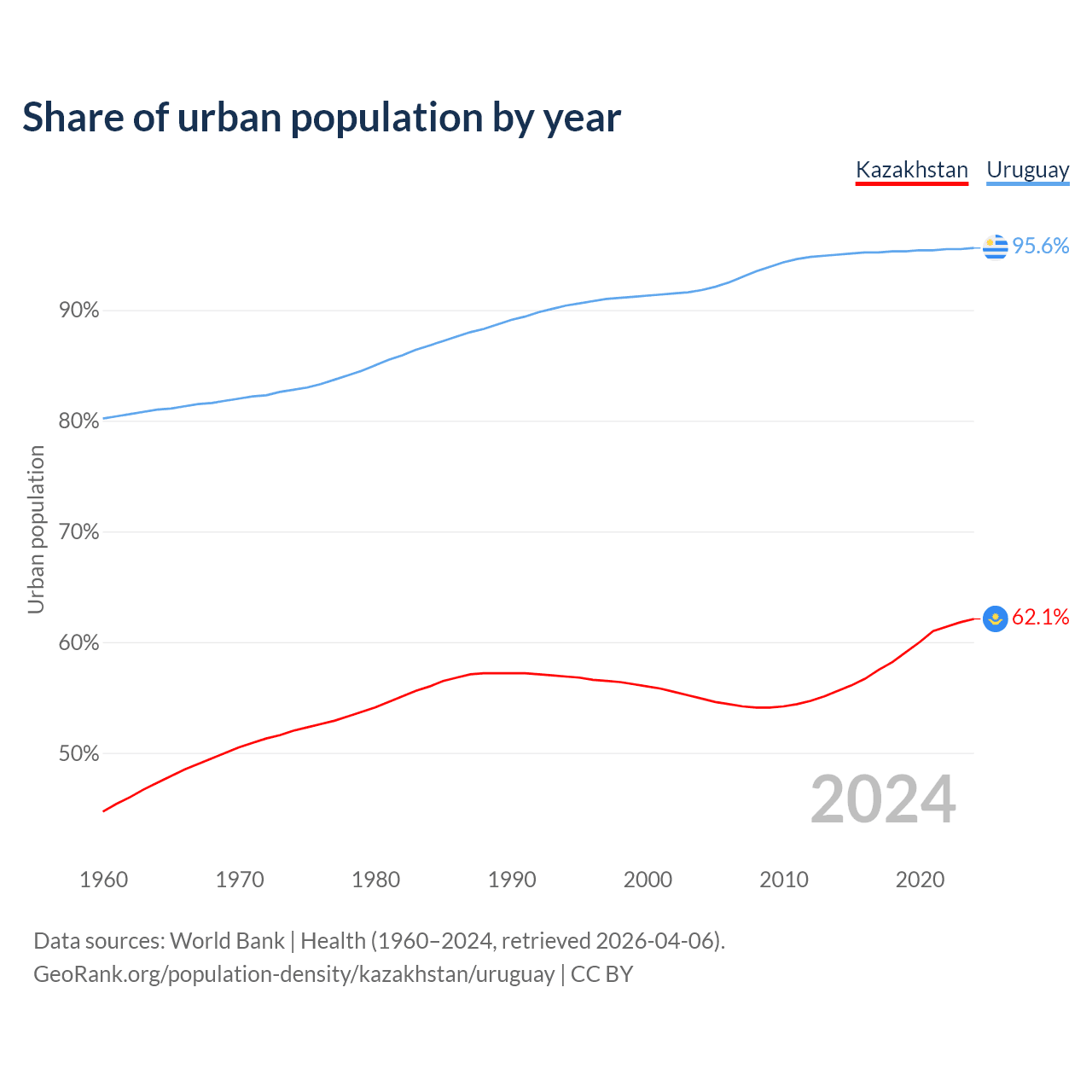 From 2004 to 2024, the share of urban population changed from 54.9% to 62.1% in Kazakhstan and from 91.8% to 95.6% in Uruguay.