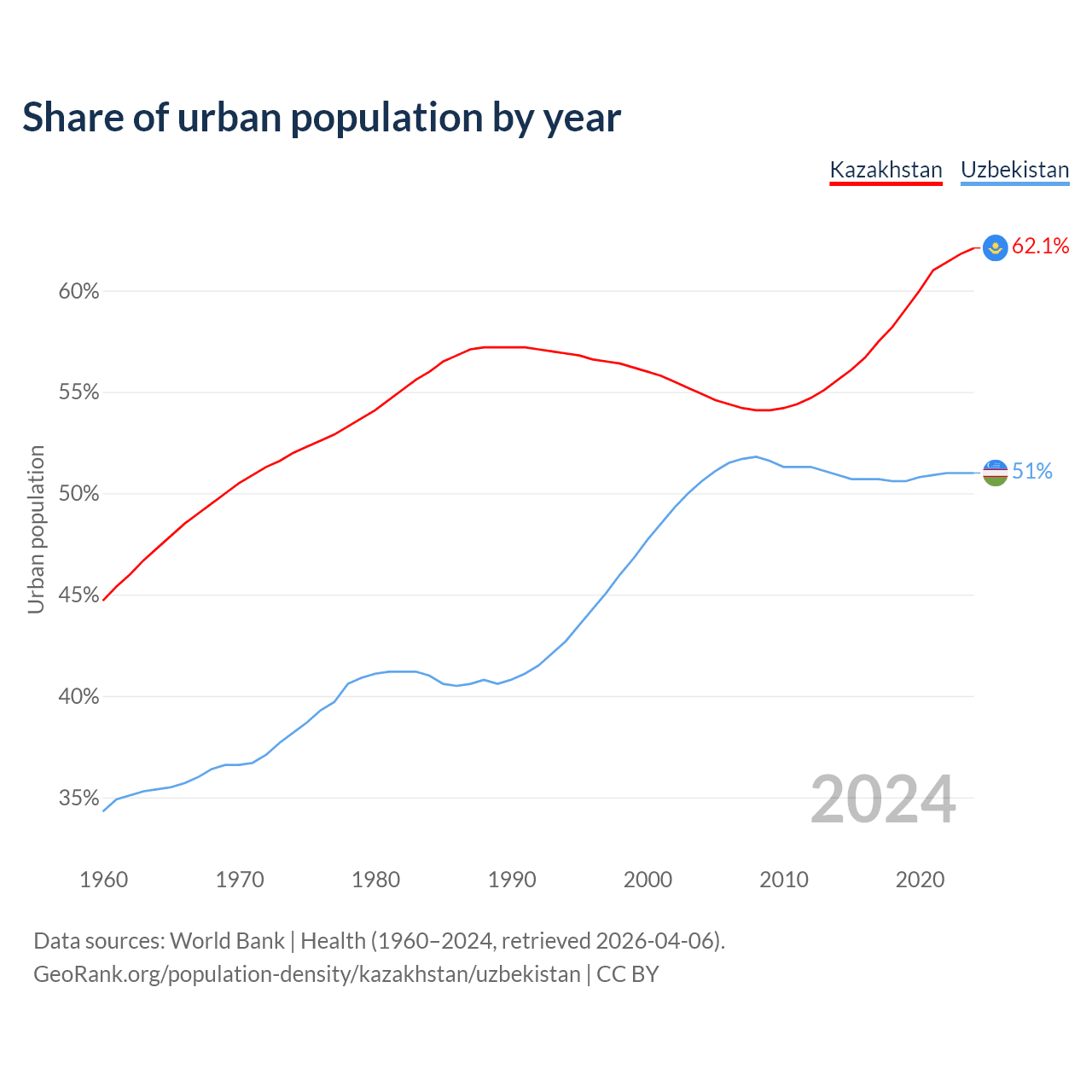 From 2004 to 2024, the share of urban population changed from 54.9% to 62.1% in Kazakhstan and from 50.6% to 51% in Uzbekistan.
