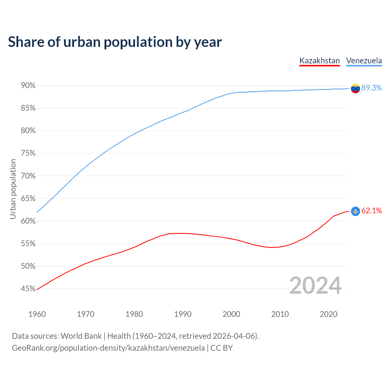 From 2004 to 2024, the share of urban population changed from 54.9% to 62.1% in Kazakhstan and from 88.6% to 89.3% in Venezuela.