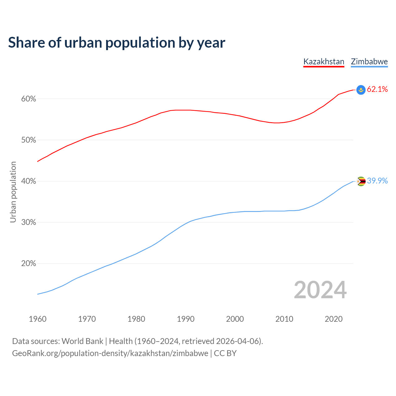 From 2004 to 2024, the share of urban population changed from 54.9% to 62.1% in Kazakhstan and from 32.6% to 39.9% in Zimbabwe.