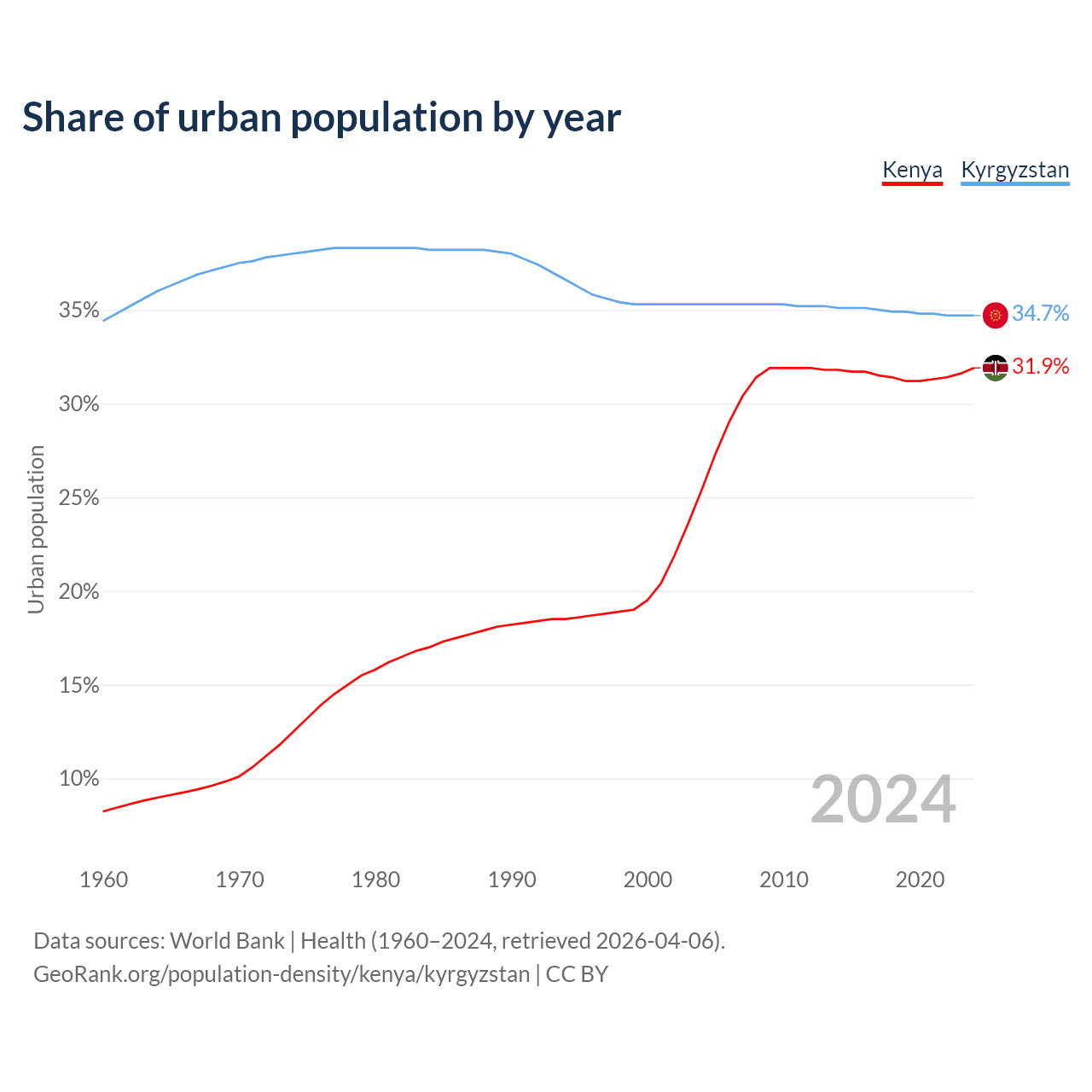 From 2004 to 2024, the share of urban population changed from 25.4% to 31.9% in Kenya and from 35.3% to 34.7% in Kyrgyzstan.