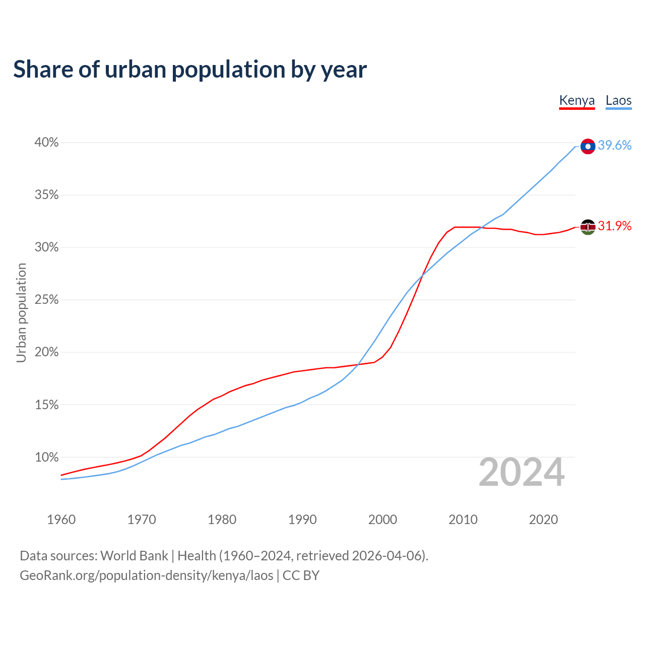 From 2004 to 2024, the share of urban population changed from 25.4% to 31.9% in Kenya and from 26.5% to 39.6% in Laos.