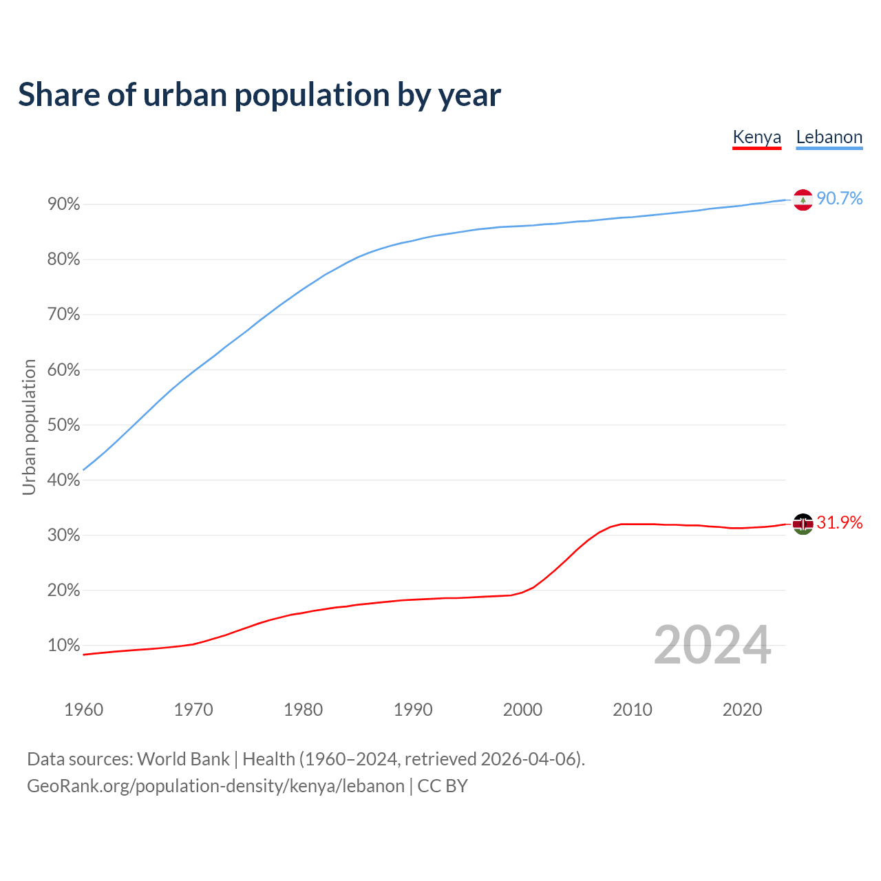 From 2004 to 2024, the share of urban population changed from 25.4% to 31.9% in Kenya and from 86.6% to 90.7% in Lebanon.