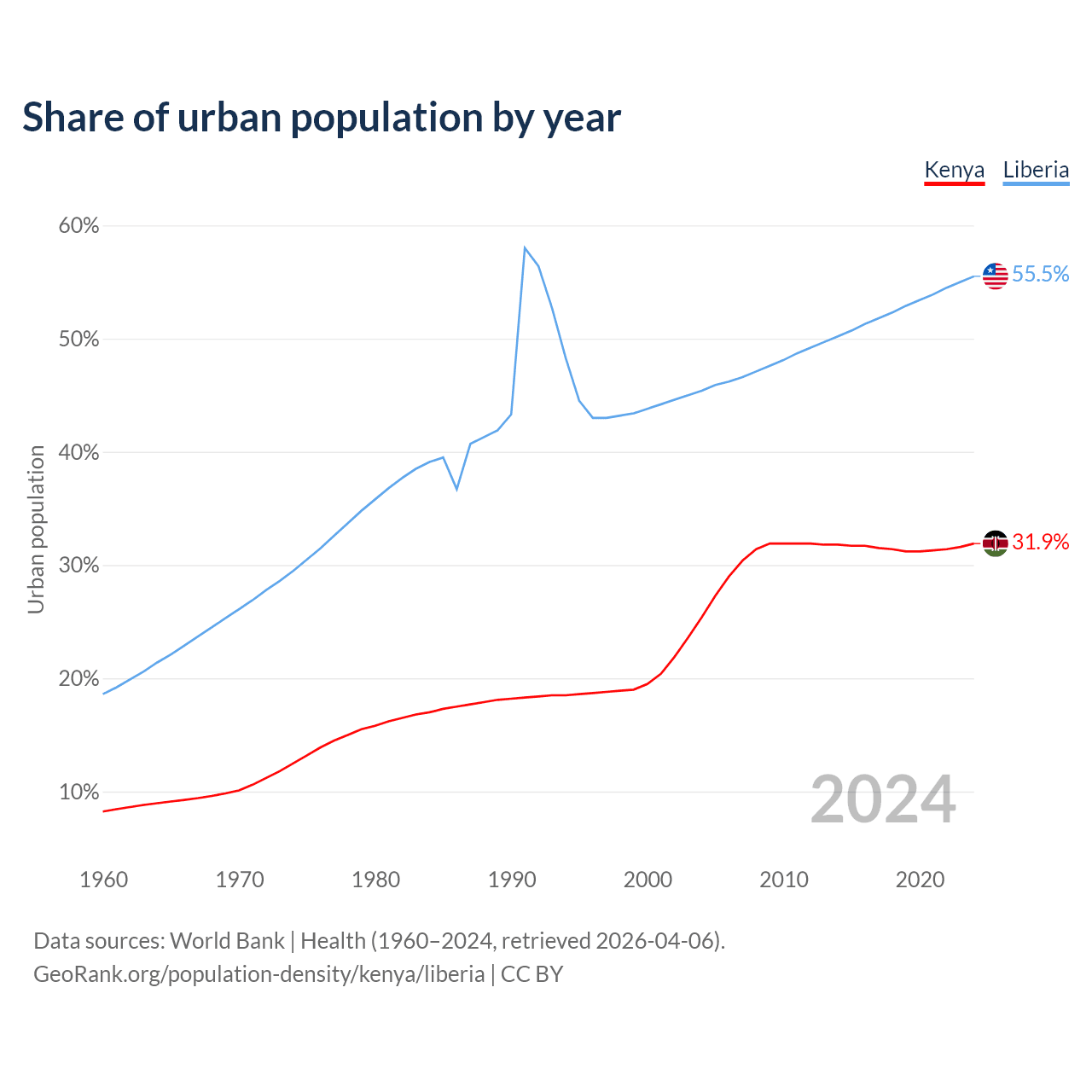 From 2004 to 2024, the share of urban population changed from 25.4% to 31.9% in Kenya and from 45.4% to 55.5% in Liberia.
