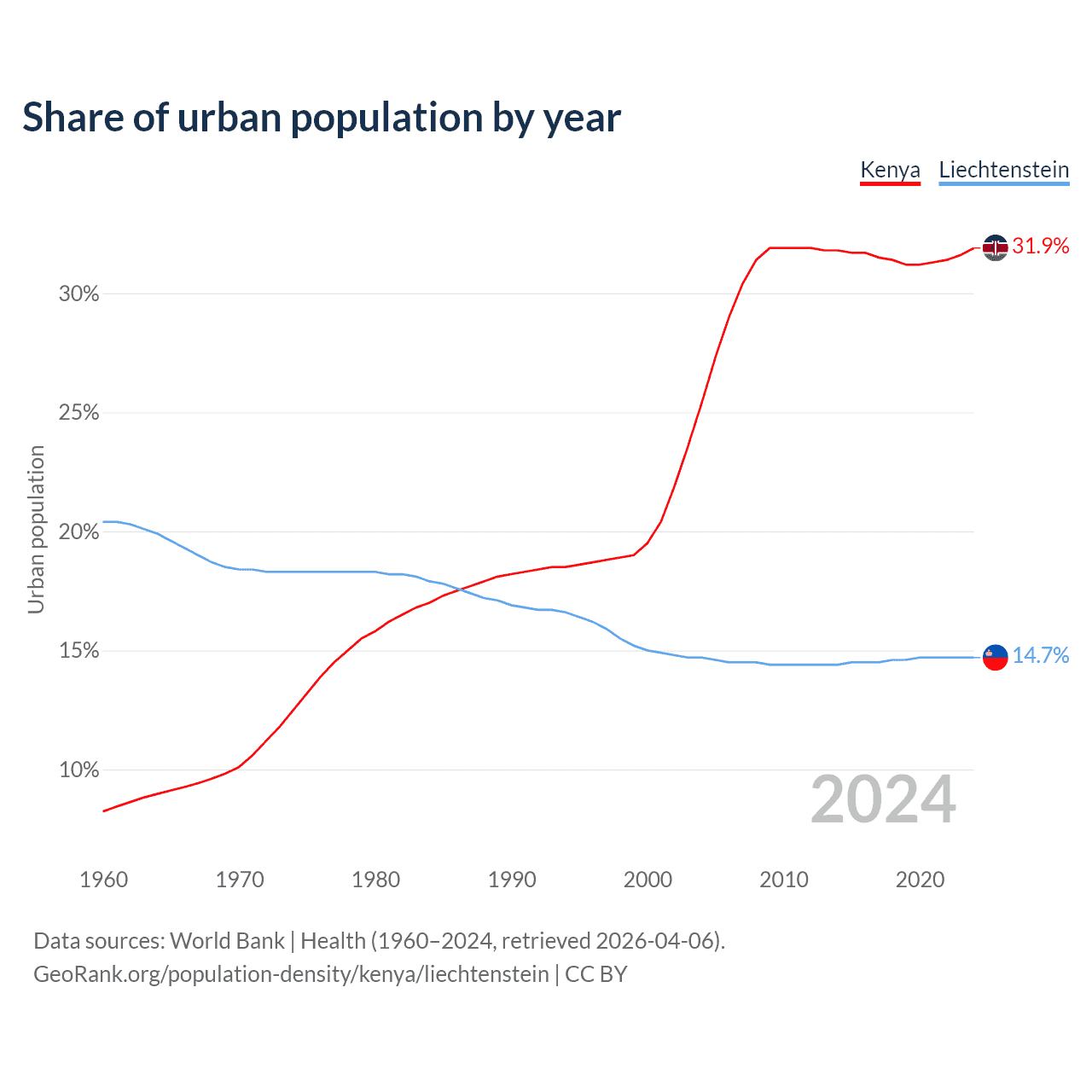 From 2004 to 2024, the share of urban population changed from 25.4% to 31.9% in Kenya and from 14.7% to 14.7% in Liechtenstein.