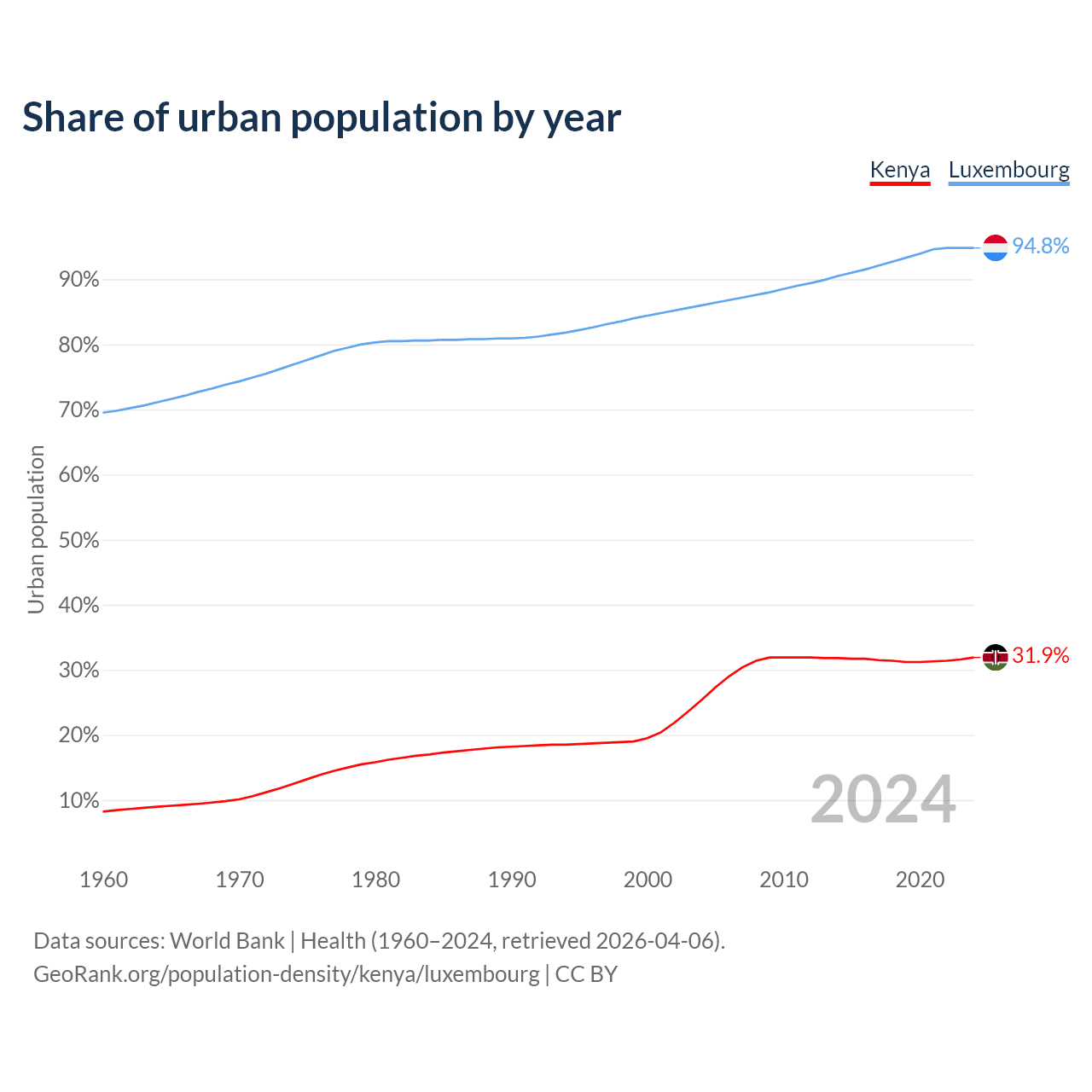 From 2004 to 2024, the share of urban population changed from 25.4% to 31.9% in Kenya and from 86% to 94.8% in Luxembourg.