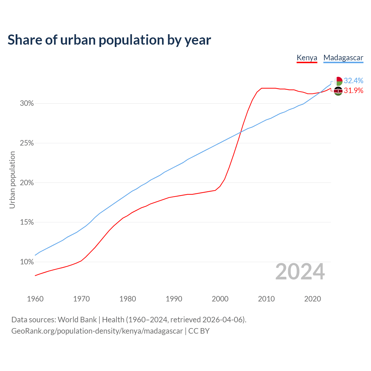 From 2004 to 2024, the share of urban population changed from 25.4% to 31.9% in Kenya and from 26.2% to 32.4% in Madagascar.