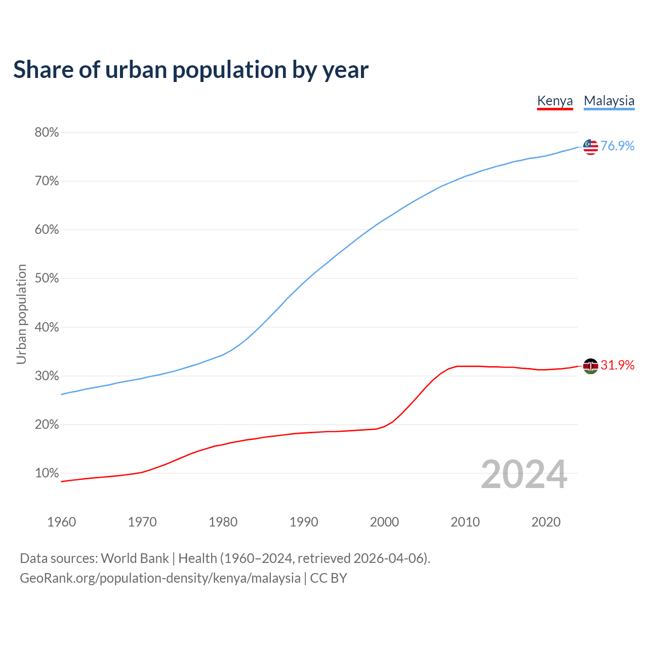 From 2004 to 2024, the share of urban population changed from 25.4% to 31.9% in Kenya and from 66.1% to 76.9% in Malaysia.