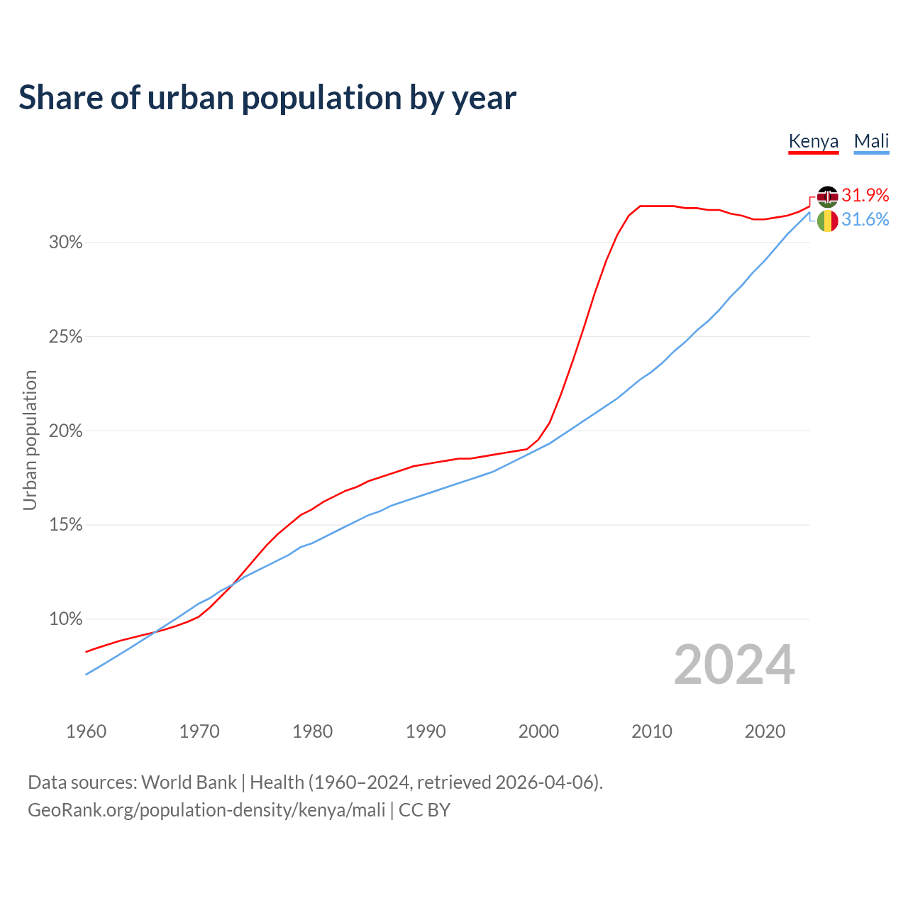 From 2004 to 2024, the share of urban population changed from 25.4% to 31.9% in Kenya and from 20.5% to 31.6% in Mali.