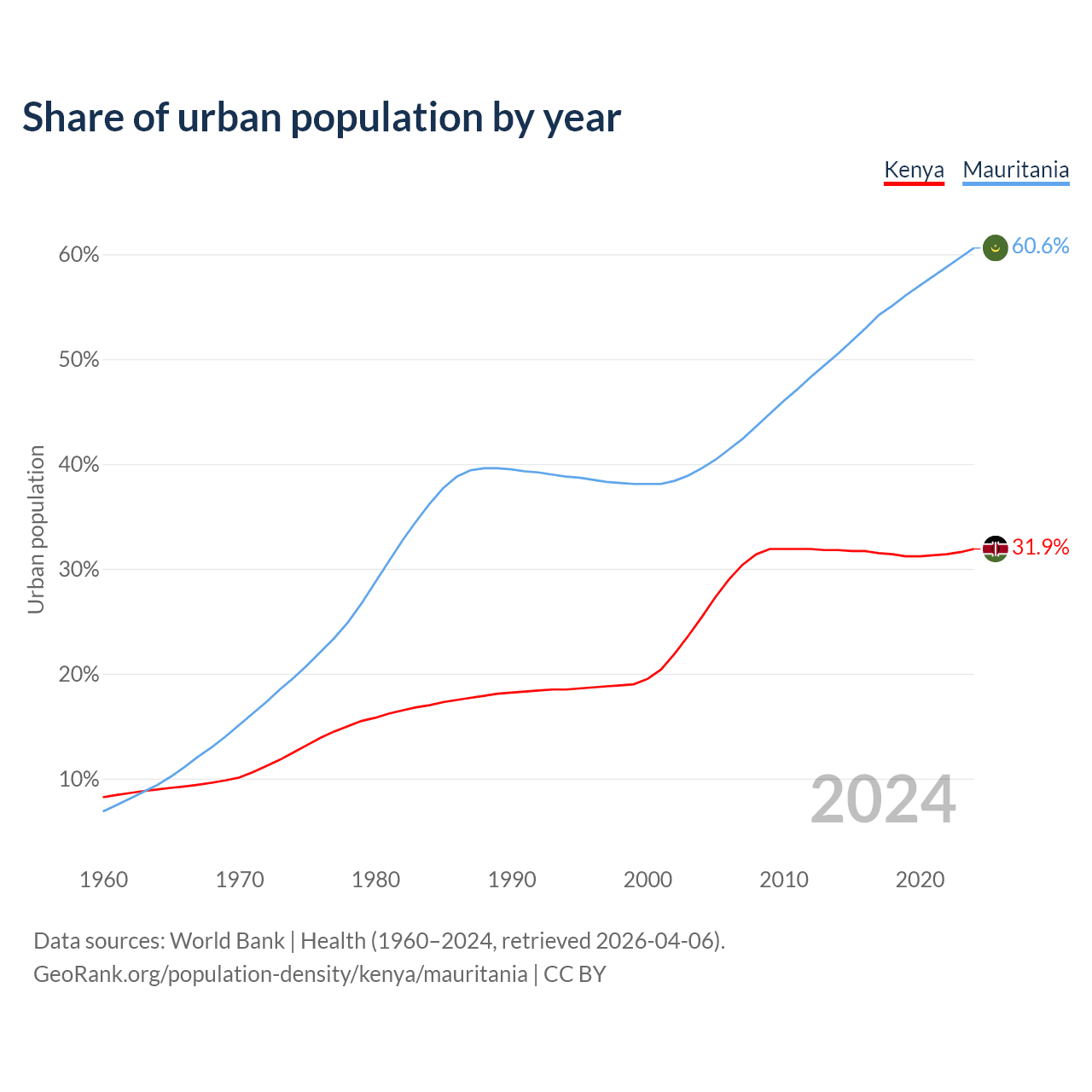 From 2004 to 2024, the share of urban population changed from 25.4% to 31.9% in Kenya and from 39.6% to 60.6% in Mauritania.
