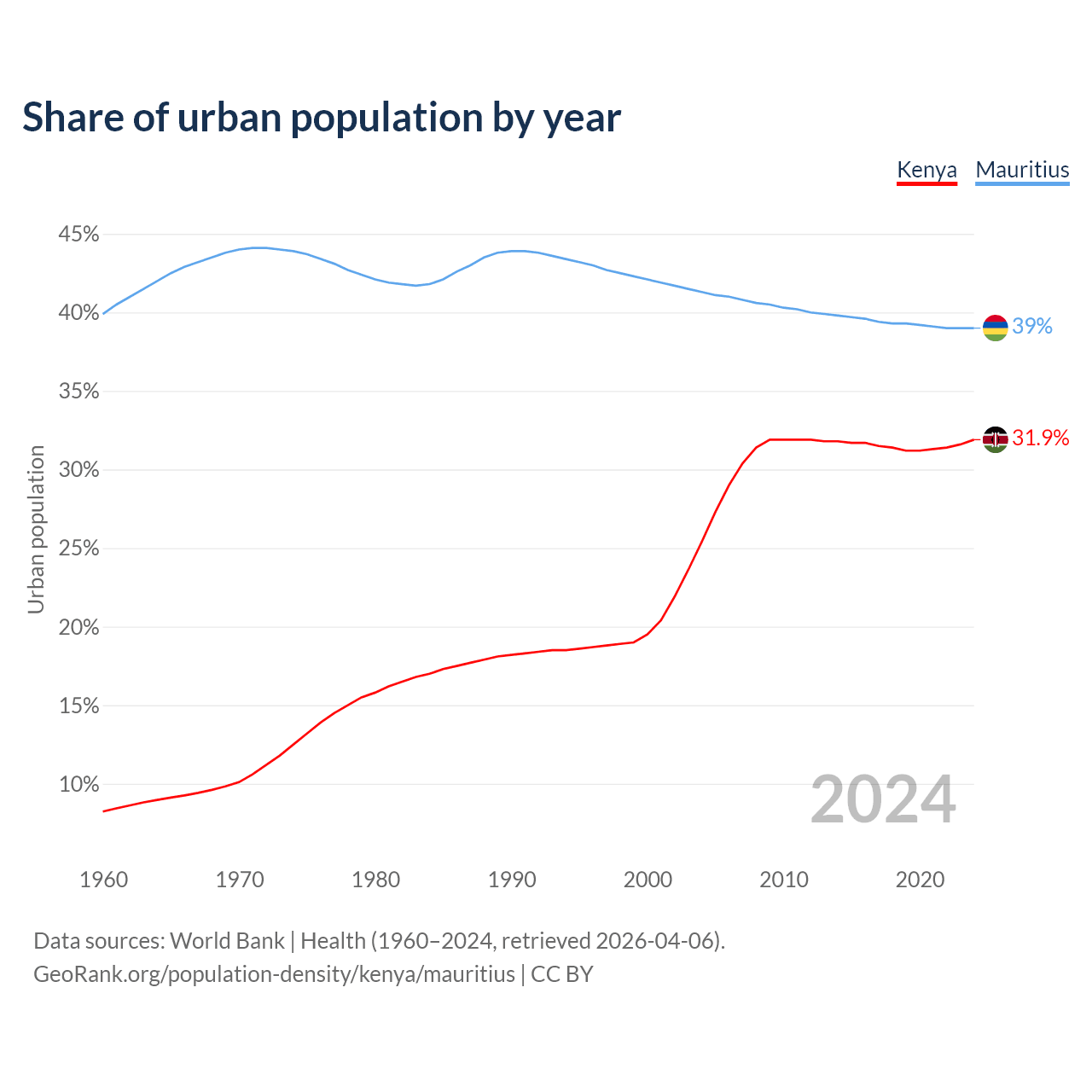 From 2004 to 2024, the share of urban population changed from 25.4% to 31.9% in Kenya and from 41.3% to 39% in Mauritius.