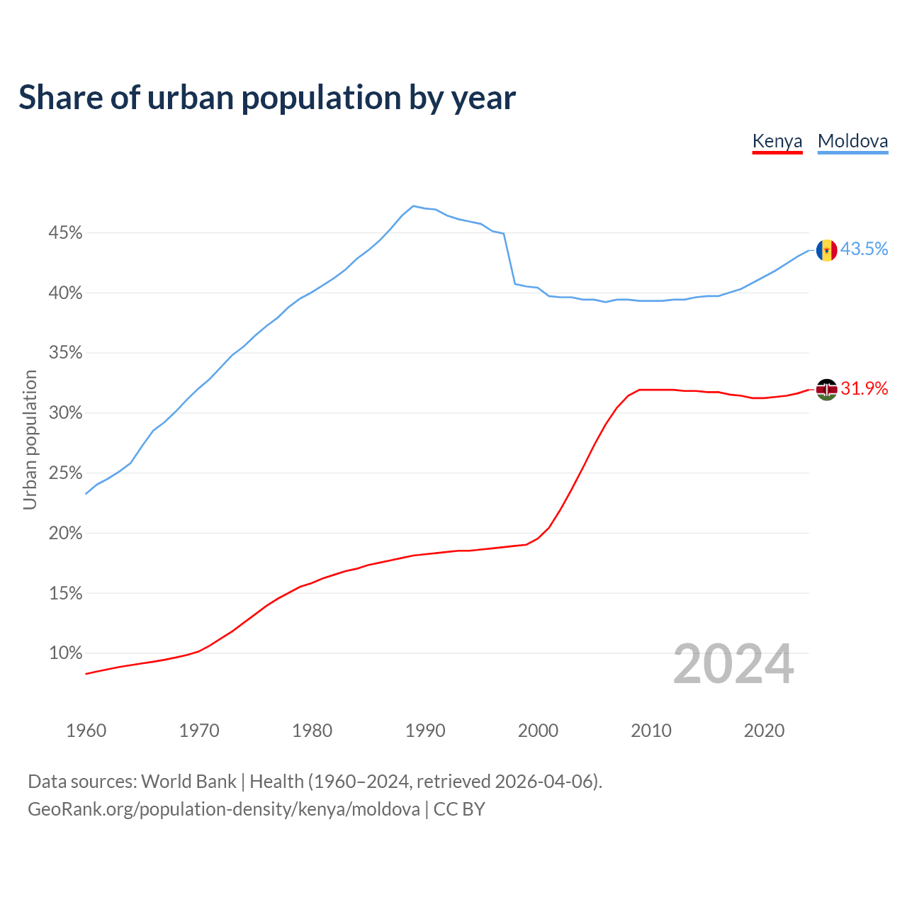 From 2004 to 2024, the share of urban population changed from 25.4% to 31.9% in Kenya and from 39.4% to 43.5% in Moldova.