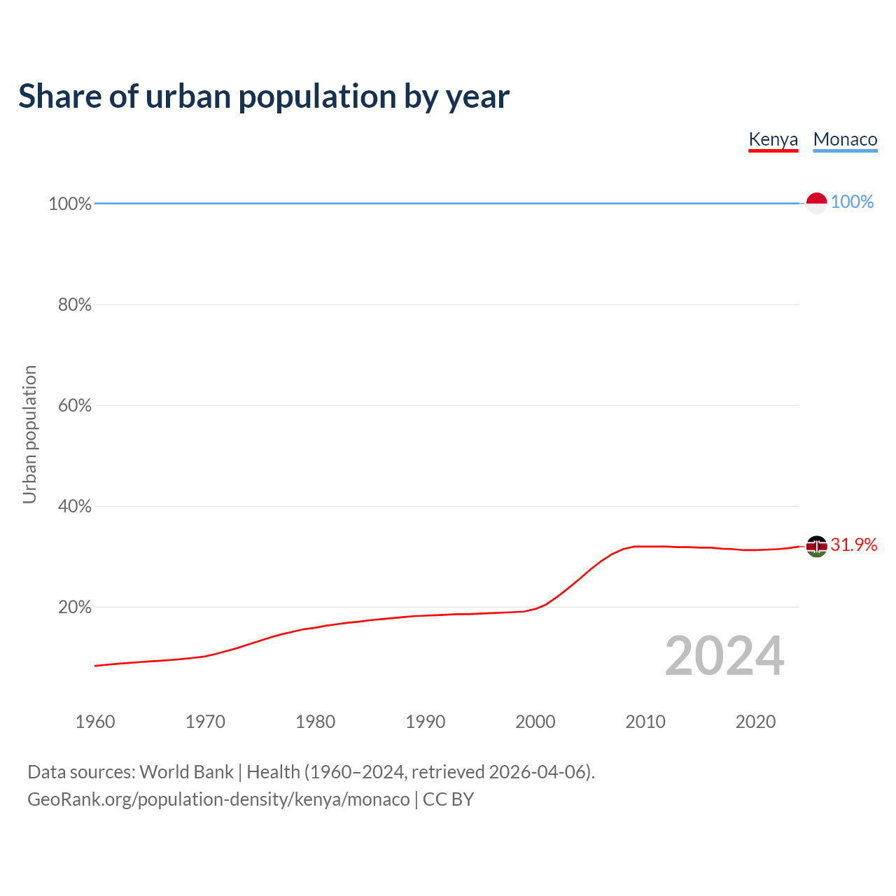 From 2004 to 2024, the share of urban population changed from 25.4% to 31.9% in Kenya and from 100% to 100% in Monaco.