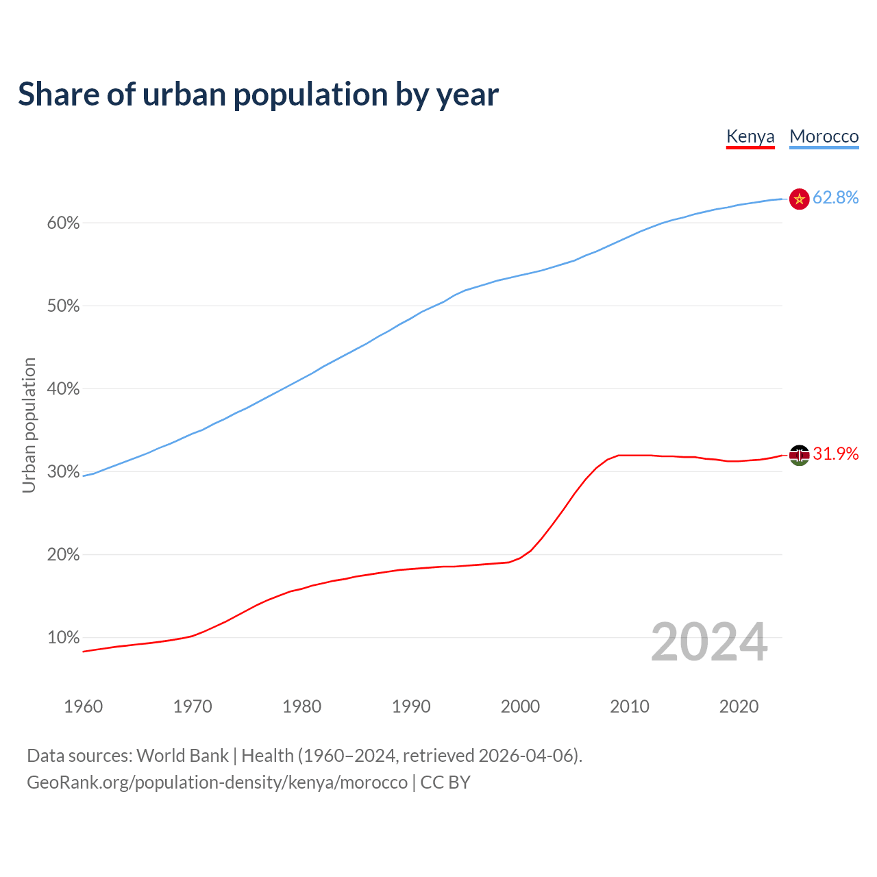 From 2004 to 2024, the share of urban population changed from 25.4% to 31.9% in Kenya and from 55% to 62.8% in Morocco.